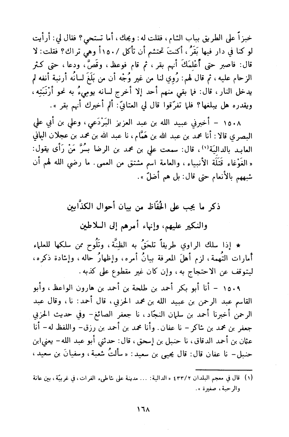 1509 - أنا أَبُو بَكْرٍ أَحْمَدُ بْنُ طَلْحَةَ بْنِ أَحْمَدَ بْنِ هَارُونَ الْوَاعِظُ وَأَبُو الْقَاسِمِ عَبْدُ الرَّحْمَنِ بْنُ عُبَيْدِ اللَّهِ بْنِ مُحَمَّدٍ الْحِزْبِيُّ قَالَ أَحْمَدُ: نا وَقَالَ عَبْدُ الرَّحْمَنِ: أَخْبَرَنَا أَحْمَدُ بْنُ سَلْمَانَ النَّجَّادُ، نا جَعْفَرٌ الصَّائِغُ، وَفِي حَدِيثِ الْحِزْبِيِّ جَعْفَرُ بْنُ مُحَمَّدِ بْنِ شَاكِرٍ نا عَفَّانُ، وأنا مُحَمَّدُ بْنُ أَحْمَدَ بْنِ رِزْقٍ وَاللَّفْظُ لَهُ أنا عُثْمَانُ بْنُ أَحْمَدَ الدَّقَّاقُ، نا حَنْبَلُ بْنُ إِسْحَاقَ، قَالَ: حَدَّثَنِي أَبُو عَبْدِ اللَّهِ يَعْنِي ابْنَ حَنْبَلٍ، نا عَفَّانُ، قَالَ: قَالَ يَحْيَى بْنُ سَعِيدٍ: " سَأَلْتُ شُعْبَةَ وَسُفْيَانَ بْنَ سَعِيدٍ -[169]- وَسُفْيَانَ بْنَ عُيَيْنَةَ وَمَالِكَ بْنَ أَنَسٍ عَنِ الرَّجُلِ، §لَا يَحْفَظُ أَوْ يُتَّهَمُ فِي الْحَدِيثِ فَقَالُوا جَمِيعًا: «بَيِّنٌ أَمْرُهُ» وَأَمَّا إِذَا كَشَفَ الرَّاوِي قِنَاعَهُ وَأَسْقَطَ فِي تَخَرُّصِ الْكَذِبِ حَيَاءَهُ فَيَجِبُ إِنْهَاءُ أَمْرِهِ إِلَى السُّلْطَانِ وَالِاسْتِعَانَةُ فِي النَّكِيرِ عَلَيْهِ بِمَنْ وُجِدَ مِنَ الْأَعْوَانِ
