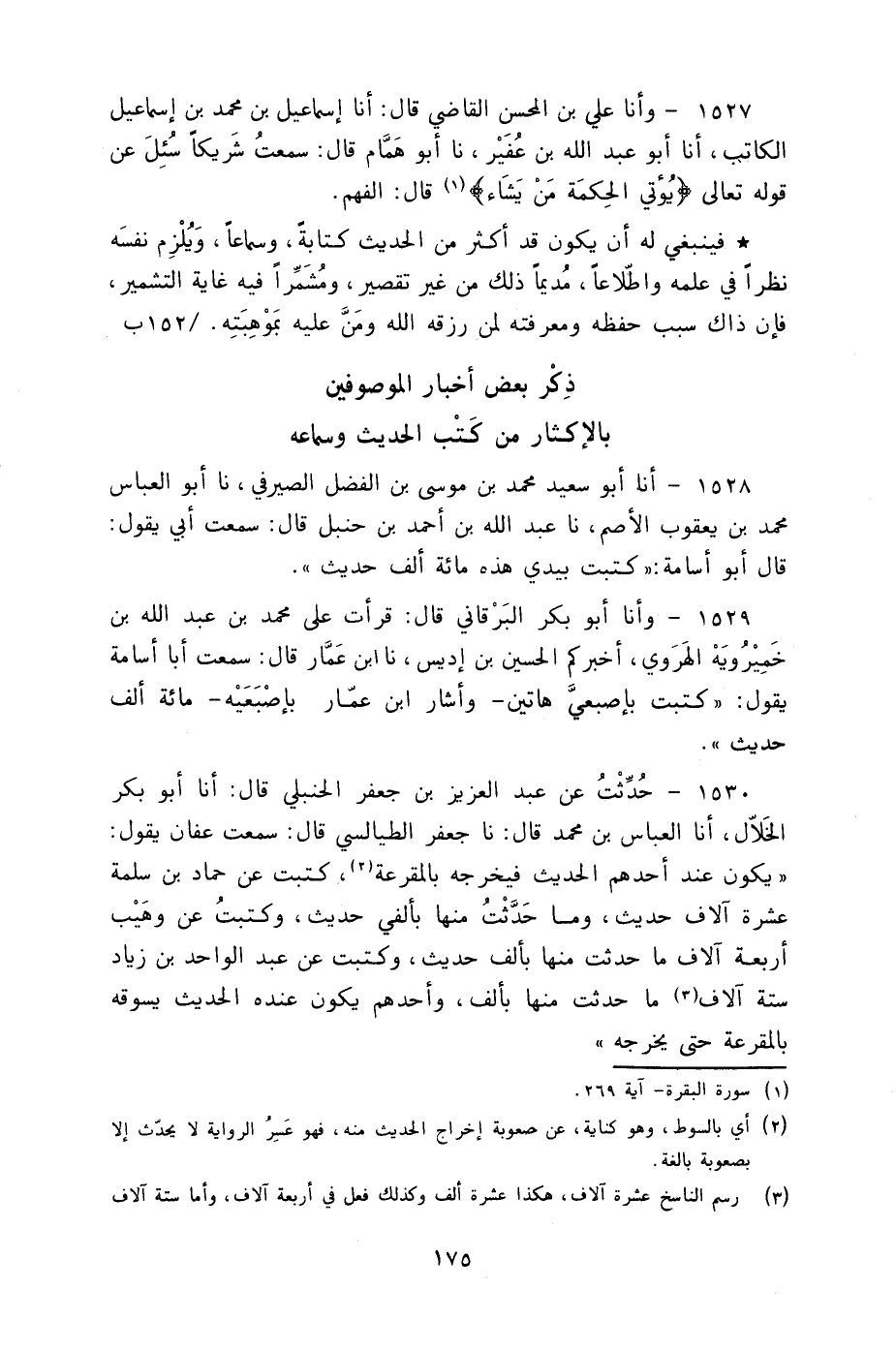 1527 - وأنا عَلِيُّ بْنُ الْمُحْسِنُ الْقَاضِي، قَالَ: أنا إِسْمَاعِيلُ بْنُ مُحَمَّدِ بْنِ إِسْمَاعِيلَ الْكَاتِبُ، أنا أَبُو عَبْدِ اللَّهِ بْنُ عُفَيْرٍ، نا أَبُو هَمَّامٍ، قَالَ: سَمِعْتُ شَرِيكًا " §سُئِلَ عَنْ قَوْلِهِ تَعَالَى {يُؤْتِي الْحِكْمَةَ مَنْ يَشَاءِ} [البقرة: 269] قَالَ: الْفَهْمَ " فَيَنْبَغِي لَهُ أَنْ يَكُونَ قَدْ أَكْثَرَ مِنَ الْحَدِيثِ كِتَابَةً وَسَمَاعًا وَيُلْزِمُ نَفْسَهُ نَظَرًا فِي عِلْمِهِ وَاطِّلَاعًا مُدِيمًا ذَلِكَ، مِنْ غَيْرِ تَقْصِيرٍ وَمُشَمِّرًا فِيهِ غَايَةَ التَّشْمِيرِ فَإِنَّ ذَاكَ سَبَبُ حِفْظِهِ وَمَعْرِفَتِهِ لِمَنْ رَزَقَهُ اللَّهُ وَمَنَّ عَلَيْهِ بِمَوْهِبَتِهِ