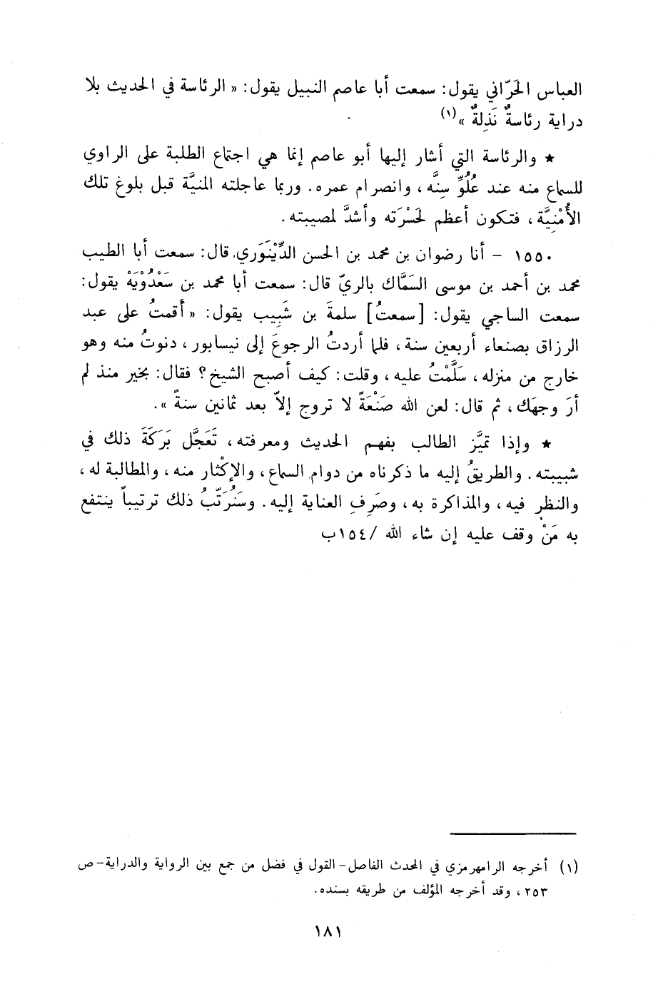 1550 - أنا رِضْوَانُ بْنُ مُحَمَّدِ بْنِ الْحَسَنِ الدِّينَوَرِيُّ، قَالَ: سَمِعْتُ أَبَا الطَّيِّبِ مُحَمَّدَ بْنَ أَحْمَدَ بْنِ مُوسَى السَّمَّاكَ بِالرَّيِّ قَالَ: سَمِعْتُ أَبَا مُحَمَّدِ بْنِ سَعْدَوَيْهِ، يَقُولُ: سَمِعْتُ السَّاجِيَّ، يَقُولُ: سَمِعْتُ سَلَمَةَ بْنَ شَبِيبٍ، يَقُولُ: §" أَقَمْتُ عَلَى عَبْدِ الرَّزَّاقِ بِصَنْعَاءَ أَرْبَعِينَ سَنَةً فَلَمَّا أَرَدْتُ الرُّجُوعَ إِلَى نَيْسَابُورَ دَنَوْتُ مِنْهُ وَهُوَ خَارِجٌ مِنْ مَنْزِلِهِ سَلَّمْتُ عَلَيْهِ وَقُلْتُ: كَيْفَ أَصْبَحَ الشَّيْخُ؟ فَقَالَ: بِخَيْرٍ مُنْذُ لَمْ أَرَ وَجْهَكَ ثُمَّ قَالَ: لَعَنِ اللَّهُ صَنْعَةً لَا تُرَوَّجُ إِلَّا بَعْدَ ثَمَانِينَ سَنَةً " وَإِذَا تَمَيَّزَ الطَّالِبُ بِفَهْمِ الْحَدِيثِ وَمَعْرِفَتِهِ تَعَجَّلَ بَرَكَةَ ذَلِكَ فِي شَبِيبَتِهِ وَالطَّرِيقُ إِلَيْهِ مَا ذَكَرْنَاهُ مِنْ دَاوَمِ السَّمَاعِ وَالْإِكْثَارِ مِنْهُ وَالْمُطَالَبَةِ لَهُ وَالنَّظَرِ فِيهِ وَالْمُذَاكَرَةِ بِهِ وَصَرْفِ الْعِنَايَةِ إِلَيْهِ وَسَنُرَتِّبُ ذَلِكَ تَرْتَيبًا يَنْتَفِعُ بِهِ مَنْ وَقَفَ عَلَيْهِ إِنْ شَاءَ اللَّهُ