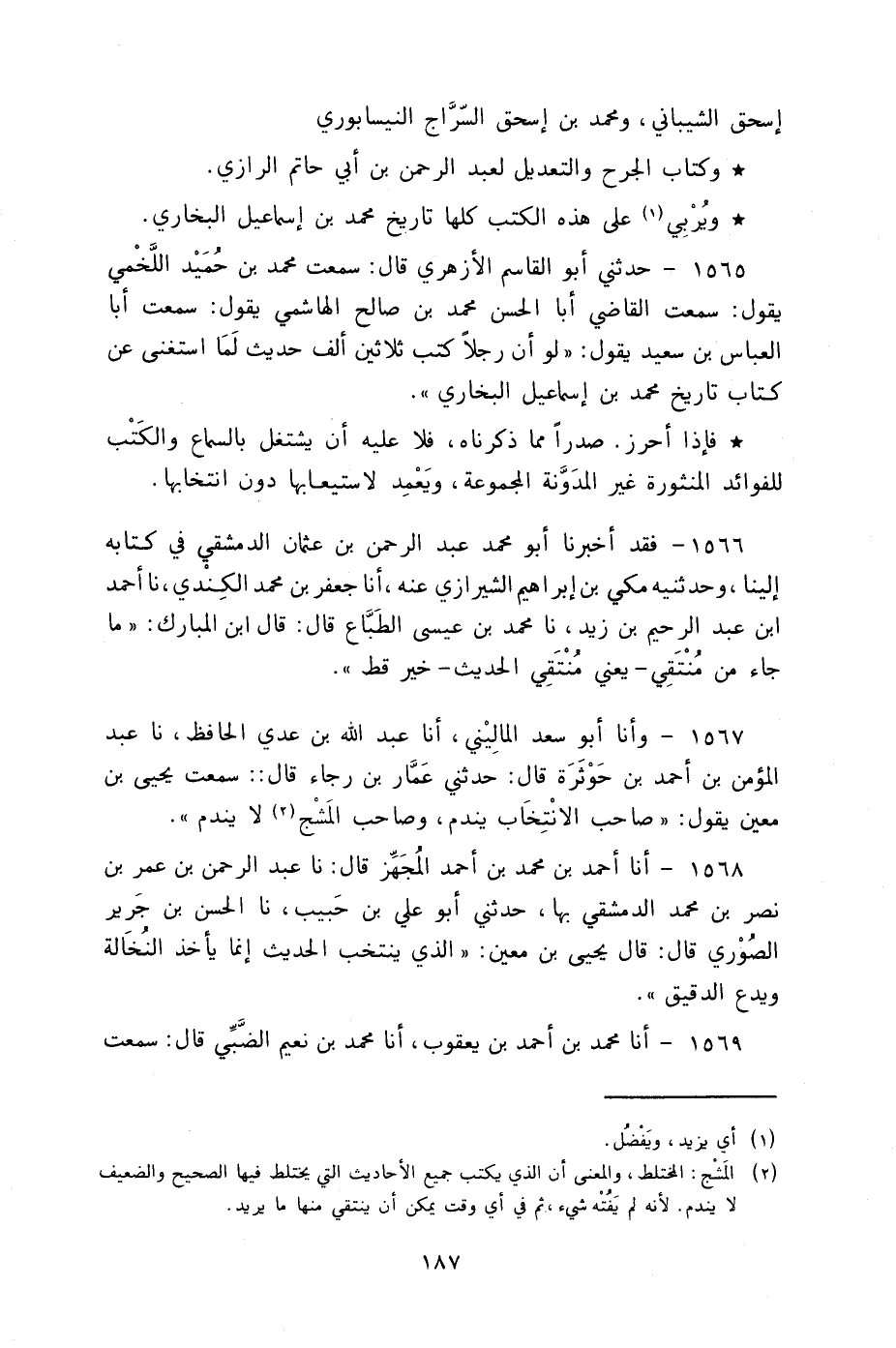 1569 - أنا مُحَمَّدُ بْنُ أَحْمَدَ بْنِ يَعْقُوبَ، أنا مُحَمَّدُ بْنُ نُعَيْمٍ الضَّبِّيُّ، قَالَ: سَمِعْتُ أَحْمَدَ بْنَ مُحَمَّدٍ الْعَتَرِيَّ، يَقُولُ: سَمِعْتُ عُثْمَانَ بْنَ سَعِيدٍ، يَقُولُ: سَمِعْتُ عَلِيَّ بْنَ الْمَدِينِيِّ، يَقُولُ: «§سَمِعْنَا مُصَنَّفَاتِ وَكِيعٍ، وَأَخْرَجَ الزِّيَادَاتِ، بَعْدُ فَخَرَجْنَا إِلَى الْكُوفَةِ فَجَعَلْنَا نَتَتَبَّعُ تِلْكَ الزِّيَادَاتِ وَيَحْيَى بْنُ مَعِينٍ يَكْتُبُ عَلَى الْوَجْهِ لِئَلَّا يَسْقُطَ عَلَيْهِ حَدِيثٌ»