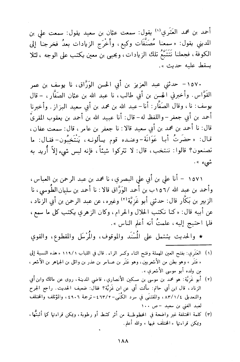 1571 - أنا عَلِيُّ بْنُ أَبِي عَلِيٍّ الْبَصْرِيُّ، نا مُحَمَّدُ بْنُ عَبْدِ الرَّحْمَنِ بْنِ الْعَبَّاسِ، وَأَحْمَدُ بْنُ عَبْدِ اللَّهِ بْنِ أَحْمَدَ الْوَرَّاقُ، قَالَا: نا أَحْمَدُ بْنُ سُلَيْمَانَ الطُّوسِيُّ، نا الزُّبَيْرُ بْنُ بَكَّارٍ، قَالَ: حَدَّثَنِي أَبُو غَزِيَّةَ، وَغَيْرُهُ، عَنْ عَبْدِ الرَّحْمَنِ بْنِ أَبِي الزِّنَادِ، عَنْ أَبِيهِ، قَالَ: §«كُنَّا نَكْتُبُ الْحَلَالَ وَالْحَرَامَ وَكَانَ الزُّهْرِيُّ يَكْتُبُ كُلَّ مَا سَمِعَ فَلَمَّا احْتِيجَ إِلَيْهِ عَلِمْتُ أَنَّهُ أَعْلَمُ النَّاسِ» وَالْحَدِيثُ يَشْتَمِلُ عَلَى الْمُسْنَدِ وَالْمَوْقُوفِ وَالْمُرْسَلِ وَالْمَقْطُوعِ وَالْقَوِيِّ -[189]- وَالضَّعِيفِ وَالصَّحِيحِ وَالسَّقِيمِ وَغَيْرِ ذَلِكَ مِنَ الْأَوْصَافِ الْمُخْتَلِفَةِ وَالنُّعُوتِ الْمُتَغَايِرَةِ وَفِي كُتُبِ الْكَلِّ فَائِدَةٌ نَحْنُ نُشِيرُ إِلَيْهَا وَنَذْكُرُهَا عَلَى التَّفْصِيلِ لِلْأَنْوَاعِ الَّتِي وَصَفْنَاهَا وَغَيْرِهَا مِمَّا لَمْ نَصِفْهُ إِنْ شَاءَ اللَّهُ