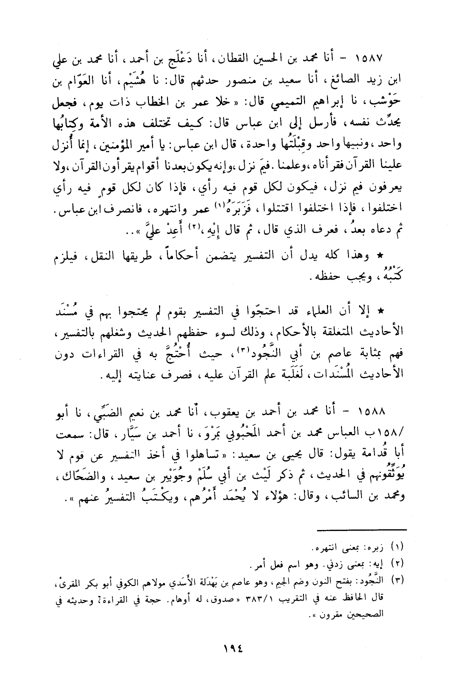 1587 - أنا مُحَمَّدُ بْنُ الْحُسَيْنِ الْقَطَّانُ، أنا دَعْلَجُ بْنُ أَحْمَدَ، أنا مُحَمَّدُ بْنُ عَلِيِّ بْنِ زَيْدٍ الصَّائِغُ، أنا سَعِيدُ بْنُ مَنْصُورٍ، حَدَّثَهُمْ قَالَ: نا هُشَيْمٌ، أنا الْعَوَّامُ بْنُ حَوْشَبٍ، نا إِبْرَاهِيمُ التَّمِيمِيُّ، قَالَ: §" خَلَا عُمَرُ بْنُ الْخَطَّابِ ذَاتَ يَوْمٍ فَجَعَلَ يُحَدِّثُ نَفْسَهُ فَأَرْسَلَ إِلَى ابْنِ عَبَّاسٍ قَالَ: كَيْفَ تَخْتَلِفُ هَذِهِ الْأُمَّةُ وِكِتَابُهَا وَاحِدٌ وَنَبِيُّهَا وَاحِدٌ وَقِبْلَتُهَا وَاحِدَةٌ؟ قَالَ ابْنُ عَبَّاسٍ: يَا أَمِيرَ الْمُؤْمِنِينَ إِنَّمَا أُنْزِلَ عَلَيْنَا الْقُرْآنُ فَقَرَأَنَاهُ وَعَلَمْنَا فِيمَ نَزَلَ وَإِنَّهُ يَكُونُ بَعْدَنَا أَقْوَامٌ يَقْرَأُونَ الْقُرْآنَ وَلَا يَعْرِفُونَ فِيمَ نَزَلَ فَيَكُونُ لِكُلِّ قَوْمٍ فِيهِ رَأْيٌ فَإِذَا كَانَ لِكُلِّ قَوْمٍ فِيهِ رَأْيٌ اخْتَلَفُوا فَإِذَا اخْتَلَفُوا اقْتَتَلُوا فَزَبَرَهُ عُمَرُ وَانْتَهَرَهُ فَانْصَرَفَ ابْنُ عَبَّاسٍ ثُمَّ دَعَاهُ بَعْدُ فَعَرَفَ الَّذِي قَالَ ثُمَّ قَالَ، إِيهِ أَعِدْ عَلَيَّ " وَهَذَا كُلُّهُ يَدُلُّ أَنَّ التَّفْسِيرَ يَتَضَمَّنُ أَحْكَامًا طَرِيقُهَا النَّقْلُ فَيَلْزَمُ كَتْبُهُ وَيَجِبُ حِفْظُهُ 0 إِلَّا أَنَّ الْعُلَمَاءَ قَدِ احْتَجُّوا فِي التَّفْسِيرِ بِقَوْمٍ لَمْ يَحْتَجُّوا بِهِمْ فِي مُسْنَدِ الْأَحَادِيثِ الْمُتَعَلِّقَةِ بِالْأَحْكَامِ وَذَلِكَ لِسُوءِ حِفْظِهِمُ الْحَدِيثَ وَشُغُلِهِمْ بِالتَّفْسِيرِ فَهُمْ بِمَثَابَةِ عَاصِمِ بْنِ أَبِي النَّجُودِ حَيْثُ احْتُجَّ بِهِ فِي الْقِرَاءَاتِ دُونَ الْأَحَادِيثِ الْمُسْنَدَاتِ لِغَلَبَةِ عِلْمُ الْقُرْآنِ عَلَيْهِ فَصَرَفَ عِنَايَتَهُ إِلَيْهِ