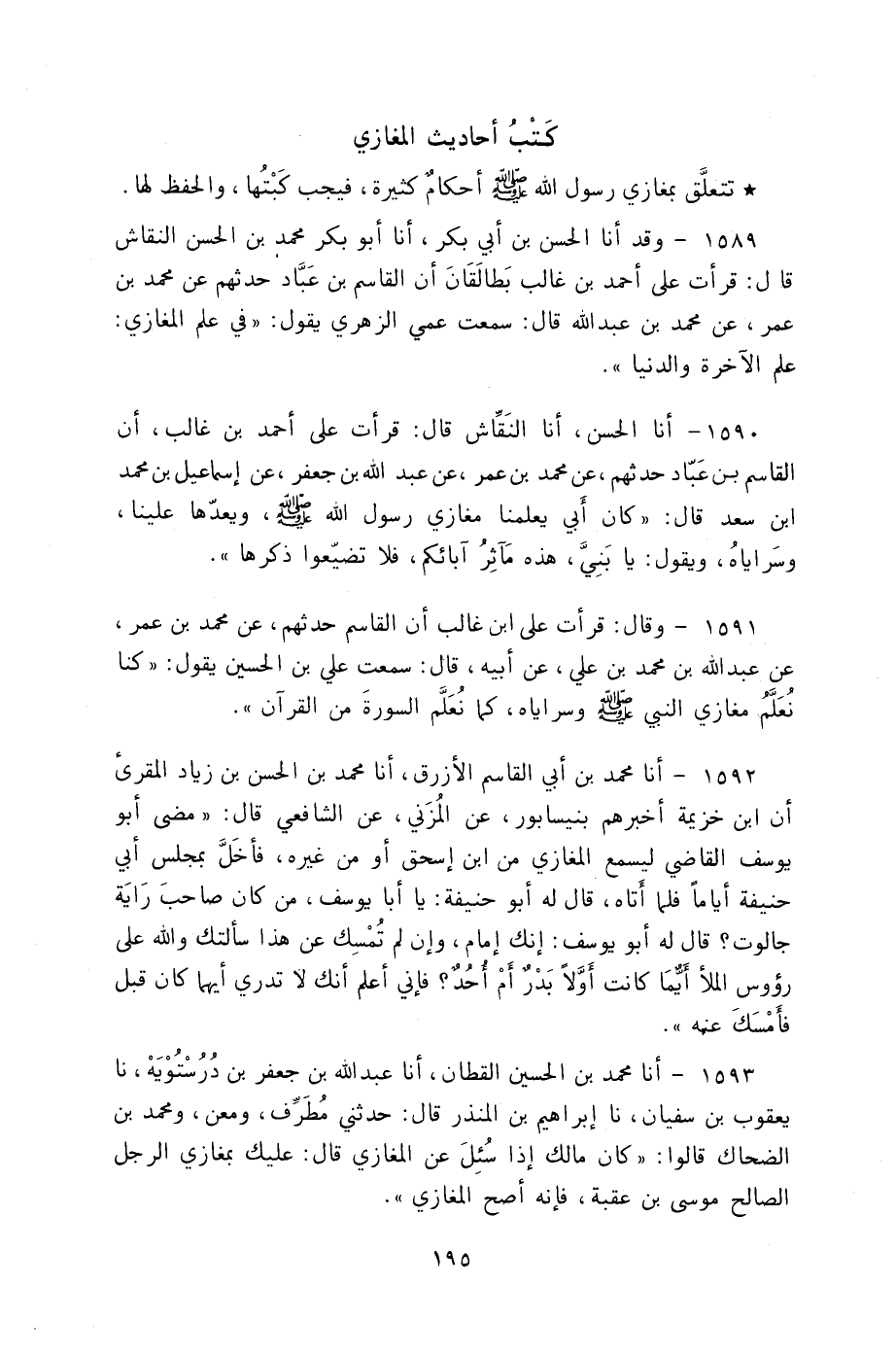 1589 - وَقَدْ أنا الْحَسَنُ بْنُ أَبِي بَكْرٍ، أنا أَبُو بَكْرٍ مُحَمَّدُ بْنُ الْحَسَنِ النَّقَّاشُ قَالَ: قَرَأْتُ عَلَى أَحْمَدَ بْنِ غَالِبٍ بِطَالَقَانَ أَنَّ الْقَاسِمَ بْنَ عَبَّادٍ، حَدَّثَهُمْ عَنْ مُحَمَّدِ بْنِ عُمَرَ، عَنْ مُحَمَّدِ بْنِ عَبْدِ اللَّهِ، قَالَ: سَمِعْتُ عَمِّي الزُّهْرِيَّ، يَقُولُ: §«فِي عِلْمِ الْمَغَازِي عِلْمُ الْآخِرَةِ وَالدُّنْيَا»