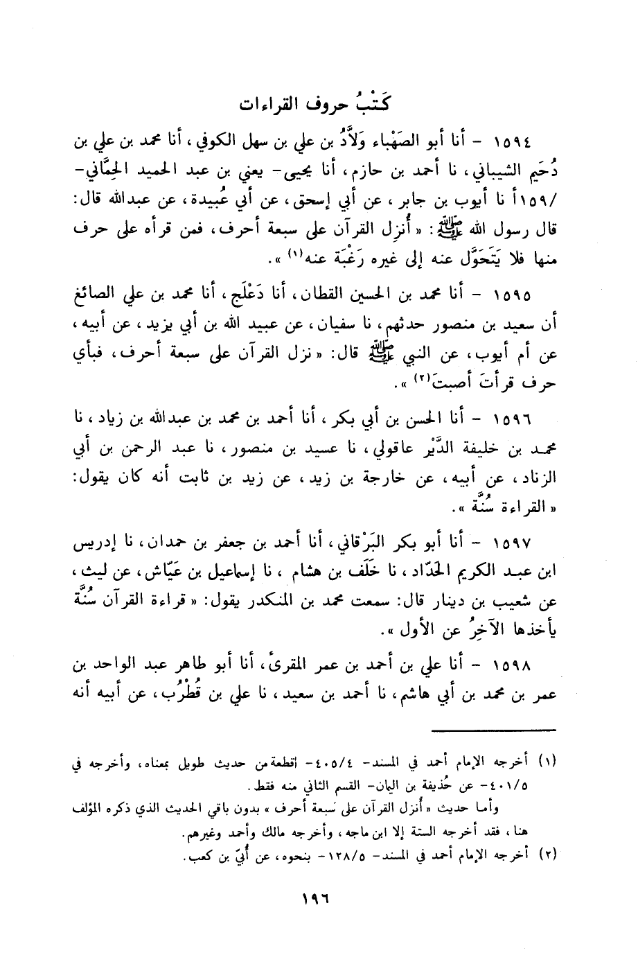 1594 - أنا أَبُو الصَّهْبَاءِ وَلَّادُ بْنُ عَلِيِّ بْنِ سَهْلٍ الْكُوفِيُّ، أنا مُحَمَّدُ بْنُ عَلِيِّ بْنِ دُحَيْمٍ الشَّيْبَانِيُّ، نا أَحْمَدُ بْنُ حَازِمٍ، أنا يَحْيَى يَعْنِي ابْنَ عَبْدِ الْحَمِيدِ الْحِمَّانِيَّ، نا أَيُّوبُ بْنُ جَابِرٍ، عَنْ أَبِي إِسْحَاقَ، عَنْ أَبِي عُبَيْدَةَ، عَنْ عَبْدِ اللَّهِ، قَالَ: قَالَ رَسُولُ اللَّهِ صَلَّى اللهُ عَلَيْهِ وَسَلَّمَ: §«أُنْزِلَ الْقُرْآنُ عَلَى سَبْعَةِ أَحْرُفٍ فَمَنْ قَرَأَهُ عَلَى حَرْفٍ مِنْهَا فَلَا يَتَحَوَّلْ عَنْهُ إِلَى غَيْرِهِ رَغْبَةً عَنْهُ»