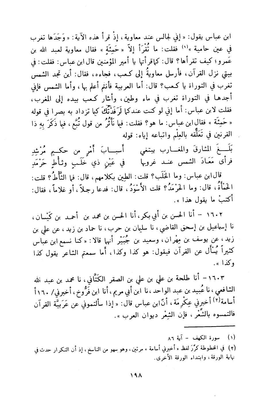 1603 - أنا طَلْحَةُ بْنُ عَلِيِّ بْنِ عَلِيِّ بْنِ الصَّقْرِ الْكَتَّانِيُّ، نا مُحَمَّدُ بْنُ عَبْدِ اللَّهِ الشَّافِعِيُّ، نا عُبَيْدُ بْنُ عَبْدِ الْوَاحِدِ، نا ابْنُ أَبِي مَرْيَمَ، أنا ابْنُ فَرُّوخَ، أَخْبَرَنِي أُسَامَةُ، أَخْبَرَنِي عِكْرِمَةُ، أَنَّ ابْنَ عَبَّاسٍ، قَالَ: «§إِذَا سَأَلْتُمُونِي عَنْ عَرَبِيَّةِ الْقُرْآنِ، فَالْتَمِسُوهُ بِالشِّعْرِ فَإِنَّ الشِّعْرَ دِيوَانُ الْعَرَبِ»