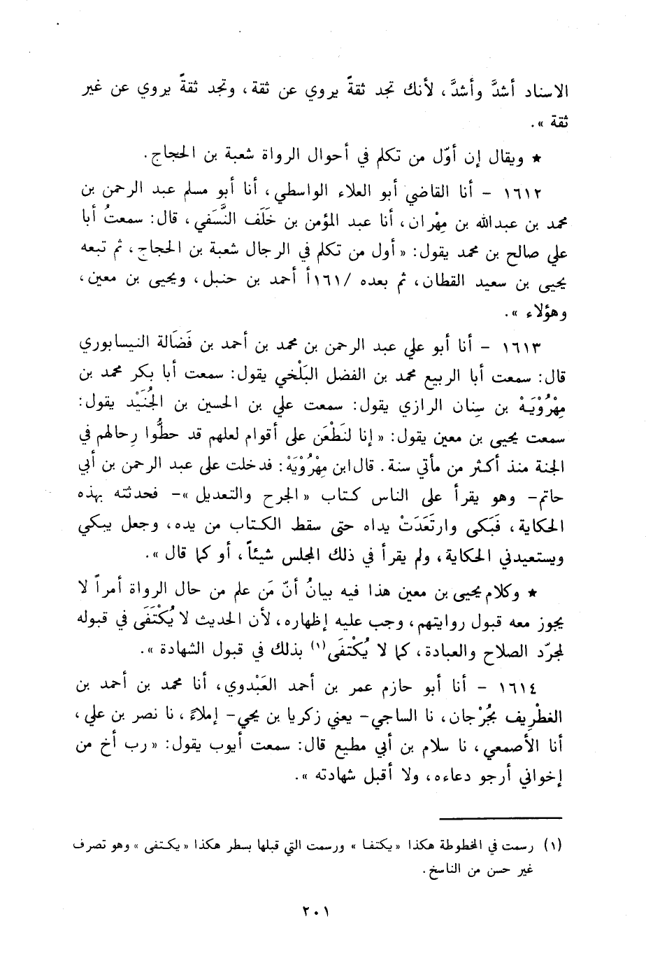 1613 - أنا أَبُو عَلِيٍّ عَبْدُ الرَّحْمَنِ بْنُ مُحَمَّدِ بْنِ أَحْمَدَ بْنِ فَضَالَةَ النَّيْسَابُورِيُّ، قَالَ: سَمِعْتُ أَبَا الرَّبِيعِ مُحَمَّدَ بْنَ الْفَضْلِ الْبَلْخِيَّ يَقُولُ: سَمِعْتُ أَبَا بَكْرٍ مُحَمَّدَ بْنَ مَهْرَوَيْهِ بْنِ سِنَانٍ الرَّازِيَّ يَقُولُ: سَمِعْتُ عَلِيَّ بْنَ الْحُسَيْنِ بْنِ الْجُنَيْدِ، يَقُولُ: سَمِعْتُ يَحْيَى بْنَ مَعِينٍ، يَقُولُ: §" إِنَّا لَنَطْعُنُ عَلَى أَقْوَامٍ لَعَلَّهُمْ قَدْ حَطُّوا رِحَالَهُمْ فِي الْجَنَّةِ مُنْذُ أَكْثَرَ مِنْ مِائَتَيْ سَنَةٍ قَالَ ابْنُ مَهْرَوَيْهِ: فَدَخَلْتُ عَلَى عَبْدِ الرَّحْمَنِ بْنِ أَبِي حَاتِمٍ وَهُوَ يَقْرَأُ عَلَى النَّاسِ كِتَابَ الْجَرْحِ وَالتَّعْدِيلِ فَحَدَّثْتُهُ بِهَذِهِ الْحِكَايَةِ فَبَكَى وَارْتَعَدَتْ يَدَاهُ حَتَّى سَقَطَ الْكِتَابُ مِنْ يَدِهِ وَجَعَلَ يَبْكِي وَيَسْتَعِيدُنِي الْحِكَايَةَ وَلَمْ يَقْرَأْ فِي ذَلِكَ الْمَجْلِسِ شَيْئًا أَوْ كَمَا قَالَ " وَكَلَامُ يَحْيَى بْنُ مَعِينٍ هَذَا فِيهِ بَيَانُ أَنَّ مَنْ عَلِمَ مِنْ حَالِ الرُّوَاةِ أَمْرًا لَا يَجُوزُ مَعَهُ قَبُولِ رِوَايَتِهِمْ وَجَبَ عَلَيْهِ إِظْهَارُهُ لِأَنَّ الْحَدِيثَ لَا يُكْتَفَى فِي قَبُولِهِ لِمُجَرَّدِ الصَّلَاحِ وَالْعِبَادَةِ كَمَا لَا يُكْتَفَى بِذَلِكِ فِي قَبُولِ الشَّهَادَةِ