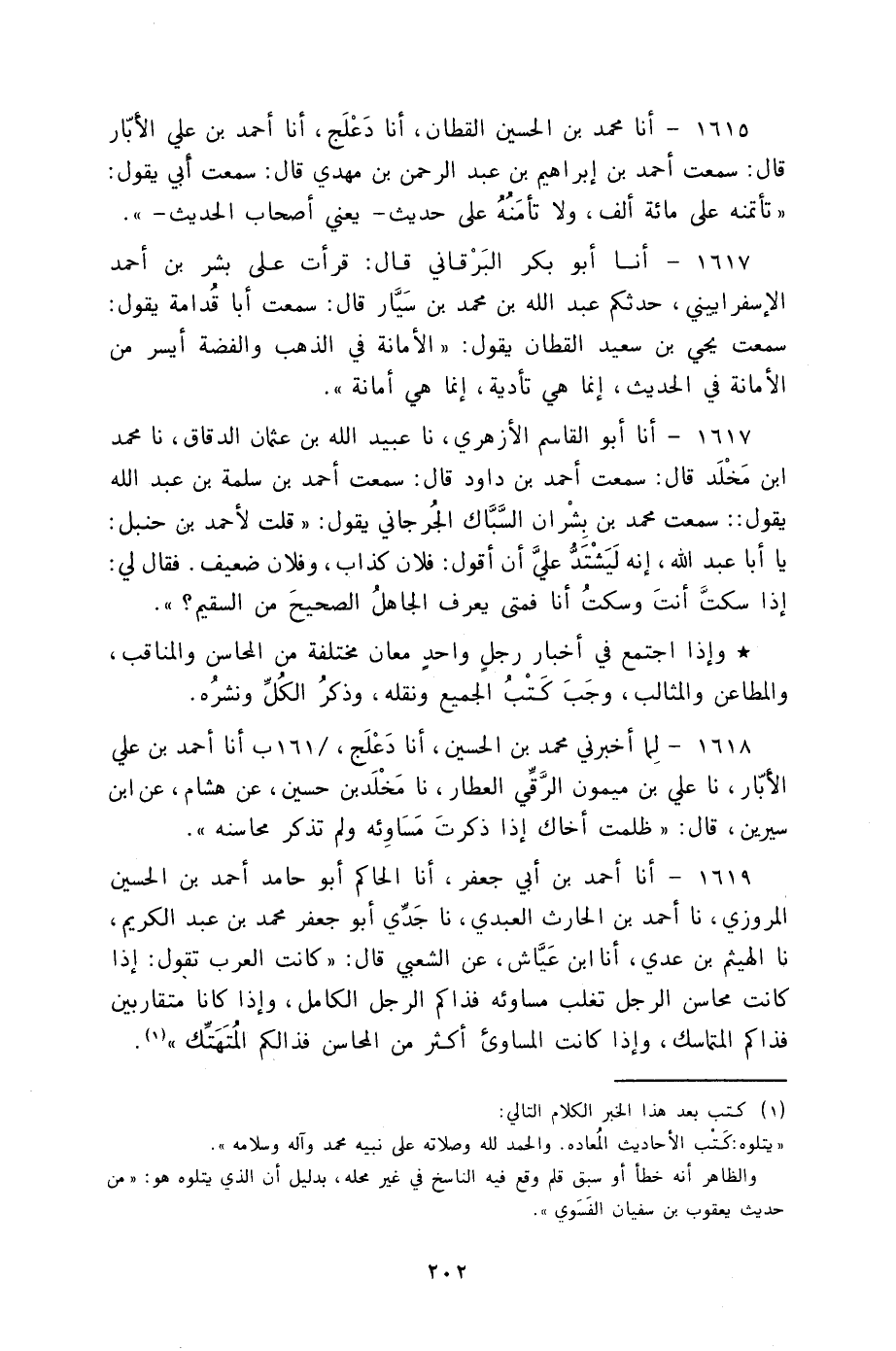 أنا أَبُو الْقَاسِمِ الْأَزْهَرِيُّ، نا عُبَيْدُ اللَّهِ بْنُ عُثْمَانَ الدَّقَّاقُ، نا مُحَمَّدُ بْنُ مَخْلَدٍ، قَالَ: سَمِعْتُ أَحْمَدَ بْنَ دَاوُدَ، قَالَ: سَمِعْتُ أَحْمَدَ بْنَ سَلَمَةَ بْنِ عَبْدِ اللَّهِ، يَقُولُ: سَمِعْتُ مُحَمَّدَ بْنَ بِشْرَانَ السَّبَّاكَ الْجُرْجَانِيَّ، يَقُولُ: قُلْتُ لِأَحْمَدَ بْنَ حَنْبَلٍ: يَا أَبَا عَبْدِ اللَّهِ إِنَّهُ لَيَشْتَدُّ عَلَيَّ أَنْ أَقُولَ: فُلَانٌ كَذَّابٌ وَفُلَانٌ ضَعِيفٌ فَقَالَ لِي: §«إِذَا سَكَتَّ أَنْتَ وَسَكَتُّ أَنَا فَمَتَى يَعْرِفُ الْجَاهِلُ الصَّحِيحَ مِنَ السَّقِيمِ؟» وَإِذَا اجْتَمَعَ فِي أَخْبَارِ رَجُلٍ وَاحِدٍ مُعَانٍ مُخْتَلِفَةٌ مِنَ الْمَحَاسِنِ وَالْمَنَاقِبِ وَالْمَطَاعِنِ وَالْمَثَالِبِ وَجَبَ كَتْبُ الْجَمِيعِ وَنَقْلُهُ وَذِكْرُ الْكَلِّ وَنَشْرُهُ