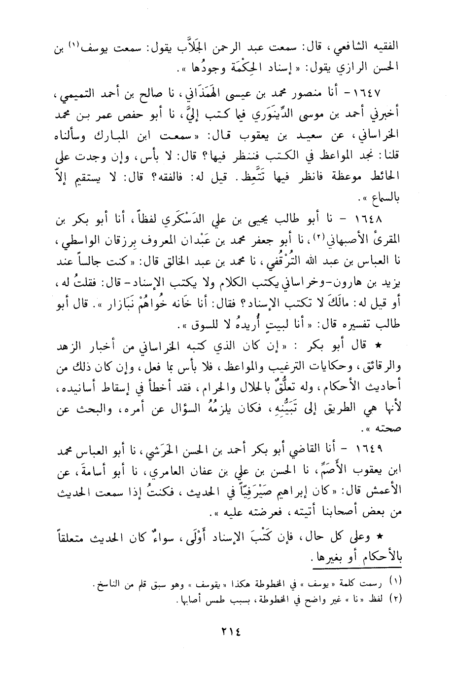 1649 - أنا الْقَاضِي أَبُو بَكْرٍ أَحْمَدُ بْنُ الْحَسَنِ الْحَرَشِيُّ نا أَبُو الْعَبَّاسِ مُحَمَّدُ بْنُ يَعْقُوبَ الْأَصَمُّ نا الْحَسَنُ بْنُ عَلِيِّ بْنِ عَفَّانَ الْعَامِرِيُّ، نا أَبُو أُسَامَةَ، عَنِ الْأَعْمَشِ، قَالَ: §«كَانَ إِبْرَاهِيمُ صَيْرَفِيًّا فِي الْحَدِيثِ فَكُنْتُ إِذَا سَمِعْتُ الْحَدِيثَ مِنْ بَعْضِ أَصْحَابِنَا أَتَيْتُهُ فَعَرَضْتُهُ عَلَيْهِ» وَعَلَى كُلِّ حَالٍ فَإِنَّ كَتْبَ الْإِسْنَادِ أَوْلَى سَوَاءٌ كَانَ الْحَدِيثُ مُتَعَلِّقًا بِالْأَحْكَامِ أَوْ بِغَيْرِهَا