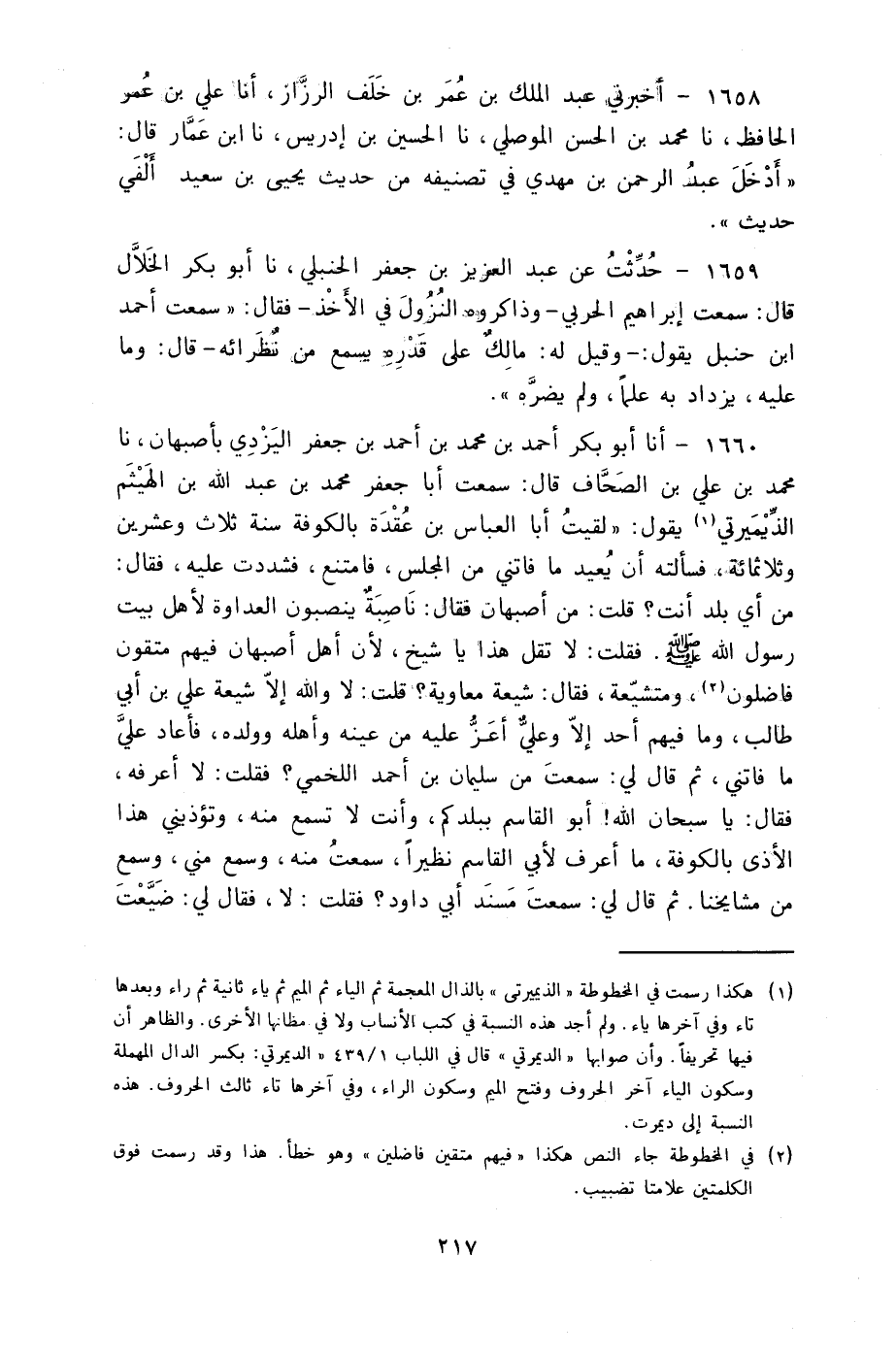 1660 - أنا أَبُو بَكْرٍ أَحْمَدُ بْنُ مُحَمَّدِ بْنِ أَحْمَدَ بْنِ جَعْفَرٍ الْيَزْدِيُّ بِأَصْبَهَانَ نا مُحَمَّدُ بْنُ عَلِيِّ بْنِ الصَّحَّافِ، قَالَ: سَمِعْتُ أَبَا جَعْفَرٍ مُحَمَّدَ بْنَ عَبْدِ اللَّهِ بْنِ الْهَيْثَمِ الذِّيمِيرْتِيَّ يَقُولُ: §" لَقِيتُ أَبَا الْعَبَّاسِ بْنَ عُقْدَةَ بِالْكُوفَةَ سَنَةَ ثَلَاثٍ وَعِشْرِينَ وَثَلَاثِمِائَةٍ فَسَأَلْتُهُ أَنْ يُعِيدَ مَا فَاتَنِي مِنَ الْمَجْلِسِ فَامْتَنَعَ فَشَدَدْتُ عَلَيْهِ فَقَالَ: مِنْ أَيِّ بَلَدٍ أَنْتَ؟ قُلْتُ: مِنْ أَصْبَهَانَ فَقَالَ: نَاصِبَةٌ يَنْصِبُونَ الْعَدَاوَةَ لِأَهْلِ بَيْتِ رَسُولِ اللَّهِ صَلَّى اللهُ عَلَيْهِ وَسَلَّمَ فَقُلْتُ: لَا تَقُلْ هَذَا يَا شَيْخُ لِأَنَّ أَهْلَ أَصْبَهَانَ فِيهِمْ مُتَّقُونَ فَاضِلُونَ وَمُتَشَيِّعَةٌ فَقَالَ: شِيعَةُ مُعَاوِيَةَ. قُلْتُ: لَا وَاللَّهِ إِلَّا شِيعَةُ عَلِيِّ بْنِ أَبِي طَالِبٍ وَمَا فِيهِمْ أَحَدٌ إِلَّا وَعَلِيٌّ أَعَزُّ عَلَيْهِ مِنْ عَيْنِهِ وَأَهْلِهِ وَوَلَدِهِ فَأَعَادَ عَلَيَّ مَا فَاتَنِي ثُمَّ قَالَ لِي: سَمِعْتَ مِنَ سُلَيْمَانَ بْنِ أَحْمَدَ اللَّخْمِيِّ؟ فَقُلْتُ: لَا أَعْرِفُهُ فَقَالَ: يَا سُبْحَانَ اللَّهِ أَبُو الْقَاسِمِ بِبَلَدِكُمْ وَأَنْتَ لَا تَسْمَعُ مِنْهُ وَتُؤْذِينِي هَذَا الْأَذَى بِالْكُوفَةِ مَا أَعْرِفُ لِأَبِي الْقَاسِمِ نَظِيرًا سَمِعْتُ مِنْهُ وَسَمِعَ مِنِّيَ وَسَمِعَ مِنْ مَشَايِخِنَا ثُمَّ قَالَ لِي: سَمِعْتَ مُسْنَدَ أَبِي دَاوُدَ؟ فَقُلْتُ: لَا فَقَالُ لِي: ضَيَّعْتَ -[218]- الْحَزْمَ لِأَنَّ مُسْنَدَ أَبِي دَاوُدَ مَنْبَعُهُ مِنْ أَصْبَهَانَ وَقَالَ لِي: تَعْرِفُ مُحَمَّدَ بْنَ حَمْزَةَ بْنِ عُمَارَةَ؟ فَقُلْتُ: شَدِيدًا رَجُلٌ مِنْ أَهْلِ الْفَضْلِ قَالَ: فَتَعْرِفُ ابْنَهُ إِبْرَاهِيمَ؟ قُلْتُ: نَعَمْ كَانَ عِنْدَنَا وَرَأَيْتُهُ حَافِظًا لِلْحَدِيثِ وَقَلَّ مَا رَأَيْتُ مِثْلَهُ فِي الْحِفْظِ "