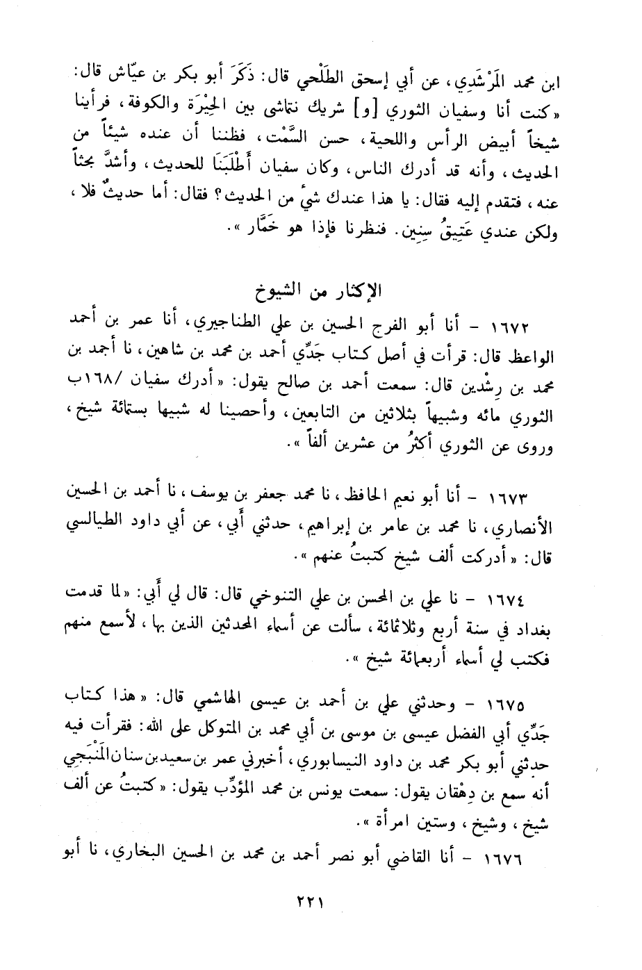 1672 - أنا أَبُو الْفَرَجِ الْحُسَيْنُ بْنُ عَلِيٍّ الطَّنَاجِيرِيُّ، أنا عُمَرُ بْنُ أَحْمَدَ الْوَاعِظُ، قَالَ: قَرَأْتُ فِي أَصْلِ كِتَابِ جَدِّي أَحْمَدَ بْنِ مُحَمَّدِ بْنِ شَاهِينَ نا أَحْمَدُ بْنُ مُحَمَّدِ بْنِ رِشْدِينَ قَالَ: سَمِعْتُ أَحْمَدَ بْنَ صَالِحٍ يَقُولُ: §«أَدْرَكَ سُفْيَانُ الثَّوْرِيُّ مِائَةً وَشَبِيهًا بِثَلَاثِينَ مِنَ التَّابِعِينَ وَأَحْصَيْنَا لَهُ شَبِيهًا بِسِتِّمِائَةِ شَيْخٍ، وَرَوَى عَنِ الثَّوْرِيِّ أَكْثَرُ مِنْ عِشْرِينَ أَلْفًا»