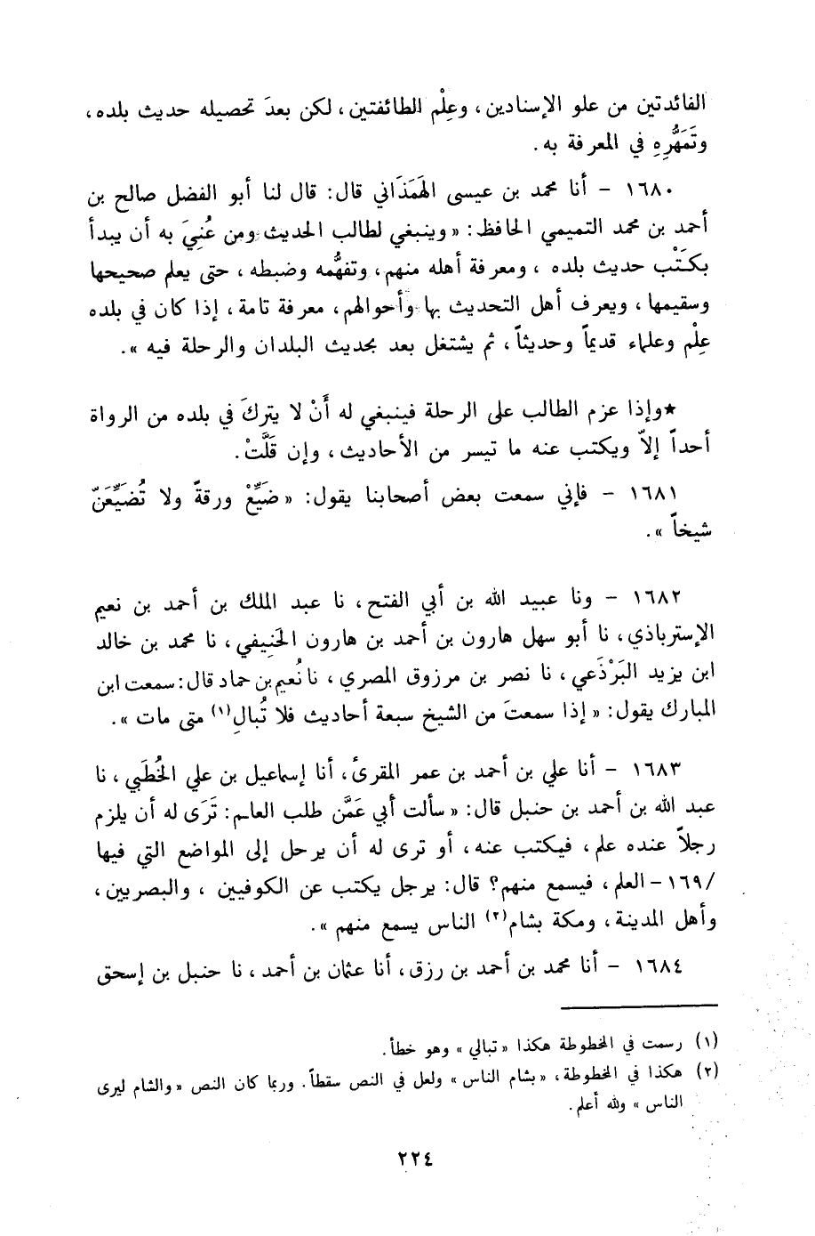 أنا مُحَمَّدُ بْنُ عِيسَى الْهَمَذَانِيُّ، قَالَ: قَالَ لَنَا أَبُو الْفَضْلِ صَالِحُ بْنُ أَحْمَدَ بْنِ مُحَمَّدٍ التَّمِيمِيُّ الْحَافِظُ: §«وَيَنْبَغِي لِطَالِبِ الْحَدِيثِ وَمَنْ عُنِيَ بِهِ أَنْ يَبْدَأَ بِكَتْبِ حَدِيثِ بَلَدِهِ وَمَعْرِفَةِ أَهْلِهِ مِنْهُمْ وَتَفَهُّمِهِ وَضَبْطِهِ حَتَّى يَعْلَمَ صَحِيحَهَا وَسَقِيمَهَا وَيَعْرِفَ أَهْلَ التَّحْدِيثِ بِهَا وَأَحْوَالِهِمْ مَعْرِفَةً تَامَّةً إِذَا كَانَ فِي بَلَدِهِ عِلْمٌ وَعُلَمَاءُ قَدِيمًا وَحَدِيثًا ثُمَّ يَشْتَغِلُ بَعْدُ بِحَدِيثِ الْبُلْدَانِ، وَالرِّحْلَةِ فِيهِ» وَإِذَا عَزَمَ الطَّالِبُ عَلَى الرِّحْلَةِ فَيَنْبَغِي لَهُ أَنْ لَا يَتْرُكَ فِي بَلَدِهِ مِنَ الرُّوَاةِ أَحَدًا إِلَّا وَيُكْتَبُ عَنْهُ مَا تَيَسَّرَ مِنَ الْأَحَادِيثِ وَإِنْ قَلَّتْ