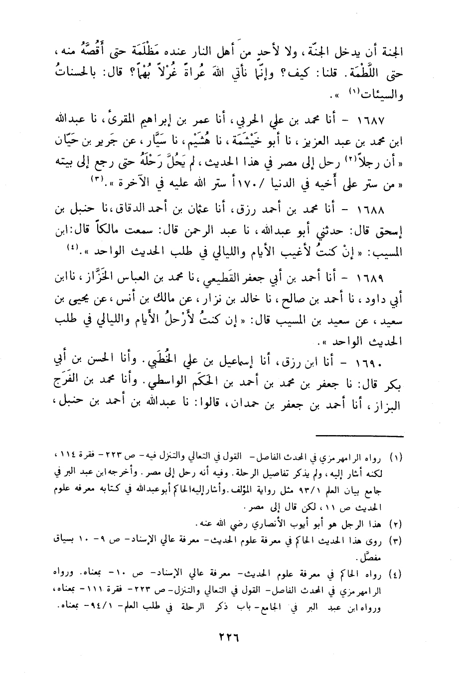 1690 - أنا ابْنُ رِزْقٍ، أنا إِسْمَاعِيلُ بْنُ عَلِيٍّ الْخُطَبِيُّ، وأنا الْحَسَنُ بْنُ أَبِي بَكْرٍ، قَالَ: نا جَعْفَرُ بْنُ مُحَمَّدِ بْنِ أَحْمَدَ بْنِ الْحَكَمِ الْوَاسِطِيُّ، وأنا مُحَمَّدُ بْنُ الْفَرَجِ الْبَزَّازُ، أنا أَحْمَدُ بْنُ جَعْفَرِ بْنِ حَمْدَانَ، قَالُوا: نا عَبْدُ اللَّهِ بْنُ أَحْمَدَ بْنِ حَنْبَلٍ، حَدَّثَنِي أَبِي، نا عَبْدُ الرَّحْمَنِ، عَنْ حَمَّادٍ، عَنْ أَيُّوبَ، قَالَ: قَالَ أَبُو قِلَابَةَ: §«لَقَدْ أَقَمْتُ بِالْمَدِينَةِ ثَلَاثًا مَالِي حَاجَةً إِلَّا رَجُلٌ عِنْدَهُ حَدِيثٌ يَقْدَمُ فَأَسْمَعُهُ مِنْهُ»