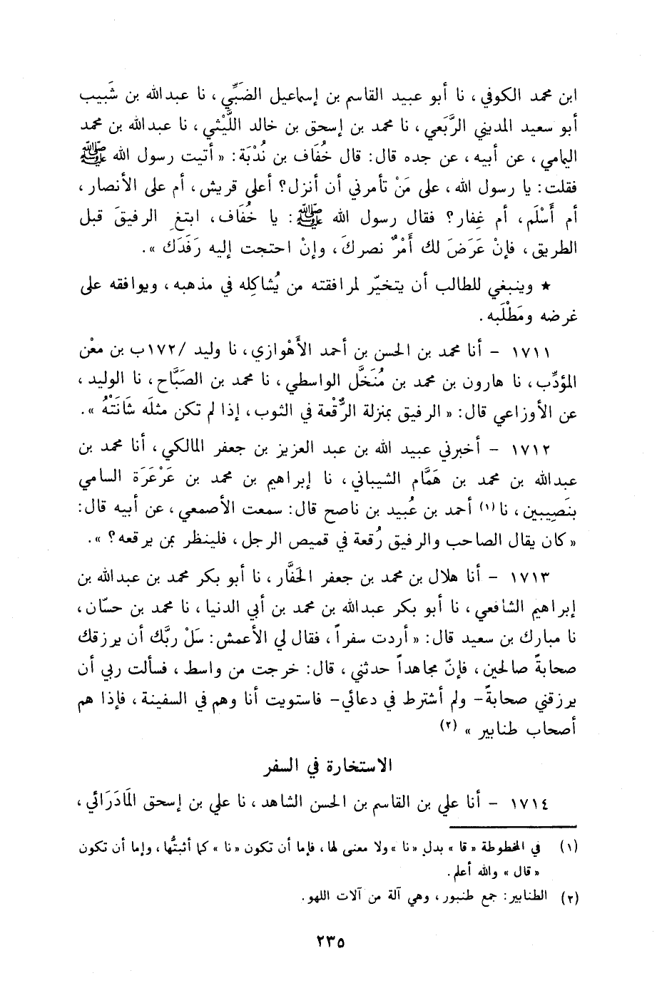 1713 - أنا هِلَالُ بْنُ مُحَمَّدِ بْنِ جَعْفَرٍ الْحَفَّارُ، نا أَبُو بَكْرٍ مُحَمَّدُ بْنُ عَبْدِ اللَّهِ بْنِ إِبْرَاهِيمَ الشَّافِعِيُّ نا أَبُو بَكْرٍ عَبْدُ اللَّهِ بْنُ مُحَمَّدِ بْنِ أَبِي الدُّنْيَا، نا مُحَمَّدُ بْنُ حَسَّانَ، نا مُبَارَكُ بْنُ سَعِيدٍ، قَالَ: " §أَرَدْتُ سَفَرًا فَقَالَ لِي الْأَعْمَشُ: سَلْ رَبَّكَ أَنْ يَرْزُقَكَ صَحَابَةً صَالِحَيْنِ فَإِنَّ مُجَاهِدًا حَدَّثَنِي قَالَ: خَرَجْتُ مِنْ وَاسِطَ فَسَأَلْتُ رَبِّي أَنْ يَرْزُقَنِي صَحَابَةً وَلَمِ اشْتَرَطْ فِي دُعَائِي فَاسْتَوَيْتُ أَنَا وَهُمْ فِي السَّفِينَةِ فَإِذَا هُمْ أَصْحَابُ طَنَابِيرَ "