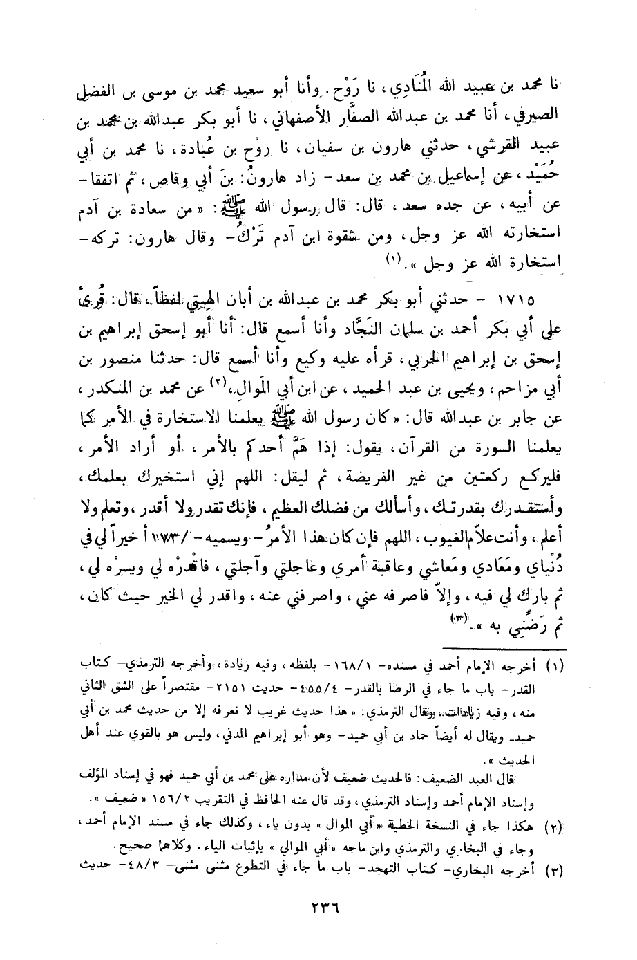1715 - حَدَّثَنِي أَبُو بَكْرٍ مُحَمَّدُ بْنُ عَبْدِ اللَّهِ بْنِ أَبَانَ الْهِيتِيُّ لَفْظًا قَالَ: قُرِئَ عَلَى أَبِي بَكْرٍ أَحْمَدَ بْنِ سَلْمَانَ النَّجَّادِ وَأَنَا أَسْمَعُ، قَالَ: أنا أَبُو إِسْحَاقَ إِبْرَاهِيمُ بْنُ إِسْحَاقَ بْنِ إِبْرَاهِيمَ الْحَرْبِيُّ قَرَأَهُ عَلَيْهِ وَكِيعٌ وَأَنَا أَسْمَعُ، قَالَ: حَدَّثَنَا مَنْصُورُ بْنُ أَبِي مُزَاحِمٍ، وَيَحْيَى بْنُ عَبْدِ الْحَمِيدِ، عَنِ ابْنِ أَبِي الْمَوَالِ، عَنْ مُحَمَّدِ بْنِ الْمُنْكَدِرِ، عَنْ جَابِرِ بْنِ عَبْدِ اللَّهِ، قَالَ: كَانَ رَسُولُ اللَّهِ صَلَّى اللهُ عَلَيْهِ وَسَلَّمَ يُعَلِّمُنَا الِاسْتِخَارَةَ فِي الْأَمْرِ كَمَا يُعَلِّمُنَا السُّورَةَ مِنَ الْقُرْآنِ يَقُولُ: §" إِذَا هَمَّ أَحَدُكُمْ بِالْأَمْرِ أَوْ أَرَادَ الْأَمْرَ فَلْيَرْكَعْ رَكْعَتَيْنِ مِنْ غَيْرِ الْفَرِيضَةِ ثُمَّ لِيَقُلِ: اللَّهُمَّ إِنِّي أَسْتَخِيرُكَ بِعِلْمِكَ وَأَسْتَقْدِرُكَ بِقُدْرَتِكَ وَأَسْأَلُكَ مِنْ فَضْلِكَ الْعَظِيمِ فَإِنَّكَ تَقْدِرُ وَلَا أَقْدِرُ وَتَعْلَمُ وَلَا أَعْلَمُ وَأَنْتَ عَلَّامُ الْغُيُوبِ اللَّهُمَّ فَإِنْ كَانَ هَذَا الْأَمْرُ وَيُسَمِّيهِ خَيْرًا لِي فِي دُنْيَايَ وَمَعَادِي وَمَعَاشِي وَعَاقِبَةِ أَمْرِي وَعَاجِلَتِي وَآجِلَتِي فَاقْدُرْهُ لِي وَيَسِّرْهُ لِي ثُمَّ بَارِكْ لِي فِيهِ وَإِلَّا فَاصْرِفْهُ عَنِّي وَاصْرِفْنِي عَنْهُ وَاقْدُرْ لِي الْخَيْرَ حَيْثُ كَانَ ثُمَّ رَضِّنِي بِهِ "