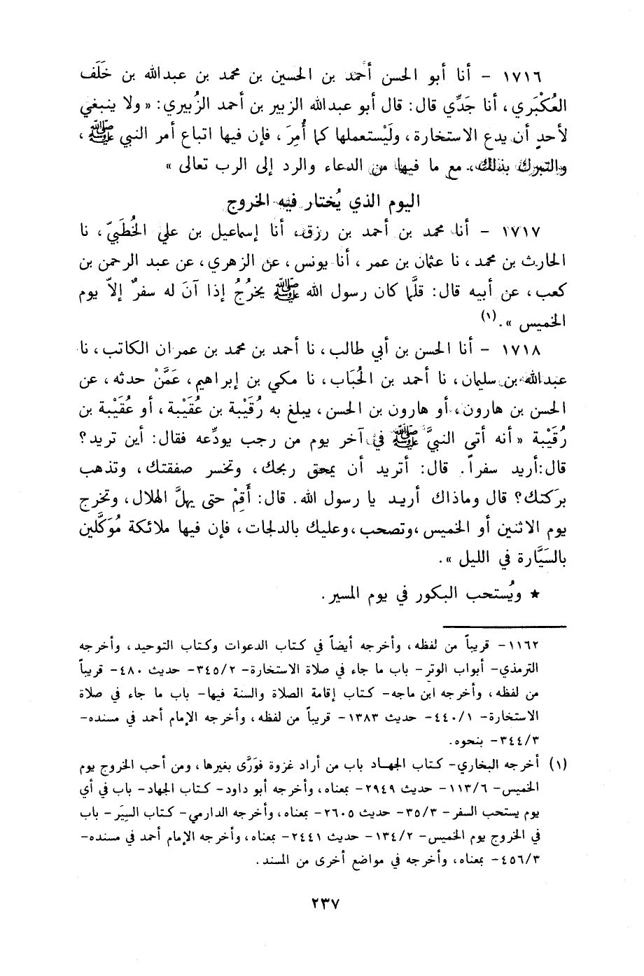 1716 - أنا أَبُو الْحَسَنِ أَحْمَدُ بْنُ الْحُسَيْنِ بْنِ مُحَمَّدِ بْنِ عَبْدِ اللَّهِ بْنِ خَلَفٍ الْعُكْبَرِيُّ أنا جَدِّي، قَالَ: قَالَ أَبُو عَبْدِ اللَّهِ الزُّبَيْرُ بْنُ أَحْمَدَ الزُّبَيْرِيُّ §«وَلَا يَنْبَغِي لِأَحَدٍ أَنْ يَدَعَ الِاسْتِخَارَةَ وَلْيَسْتَعْمِلْهَا كَمَا أُمِرَ فَإِنَّ فِيهَا اتِّبَاعَ أَمْرِ النَّبِيِّ صَلَّى اللهُ عَلَيْهِ وَسَلَّمَ وَالتَّبَرُّكَ بِذَلِكَ مَعَ مَا فِيهَا مِنَ الدُّعَاءِ وَالرَّدِّ إِلَى الرَّبِّ تَعَالَى»