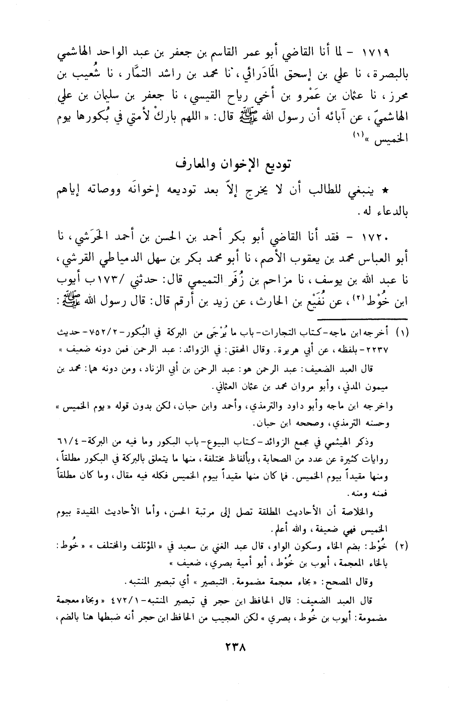 1719 - لَمَّا أنا الْقَاضِي أَبُو عُمَرَ الْقَاسِمُ بْنُ جَعْفَرِ بْنِ عَبْدِ الْوَاحِدِ الْهَاشِمِيُّ، بِالْبَصْرَةِ نا عَلِيُّ بْنُ إِسْحَاقَ الْمَادَرَائِيُّ، نا مُحَمَّدُ بْنُ رَاشِدٍ التَّمَّارُ، نا شُعَيْبُ بْنُ مُحْرِزٍ، نا عُثْمَانُ بْنُ عَمْرِو ابْنِ أَخِي رِيَاحٍ الْقَيْسِيُّ نا جَعْفَرُ بْنُ سُلَيْمَانَ بْنِ عَلِيٍّ الْهَاشِمِيُّ، عَنْ آبَائِهِ أَنَّ رَسُولَ اللَّهِ صَلَّى اللهُ عَلَيْهِ وَسَلَّمَ قَالَ: §«اللَّهُمَّ بَارِكْ لِأُمَّتِي فِي بُكُورِهَا يَوْمَ الْخَمِيسِ»
