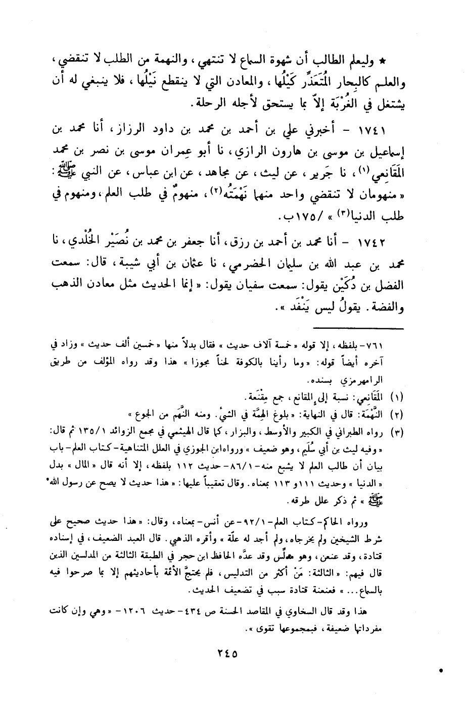 1741 - أَخْبَرَنِي عَلِيُّ بْنُ أَحْمَدَ بْنِ مُحَمَّدِ بْنِ دَاوُدَ الرَّزَّازُ، أنا مُحَمَّدُ بْنُ إِسْمَاعِيلَ بْنِ مُوسَى بْنِ هَارُونَ الرَّازِيُّ، نا أَبُو عِمْرَانَ مُوسَى بْنُ نَصْرِ بْنِ مُحَمَّدٍ الْمَقَانِعِيُّ نا جَرِيرٌ، عَنْ لَيْثٍ، عَنْ مُجَاهِدٍ، عَنِ ابْنِ عَبَّاسٍ، عَنِ النَّبِيِّ صَلَّى اللهُ عَلَيْهِ وَسَلَّمَ: §«مَنْهُومَانِ لَا تَنْقَضِي وَاحِدٌ مِنْهُمَا نَهْمَتَهُ مَنْهُومٌ فِي طَلَبِ الْعِلْمِ وَمَنْهُومٌ فِي طَلَبِ الدُّنْيَا»