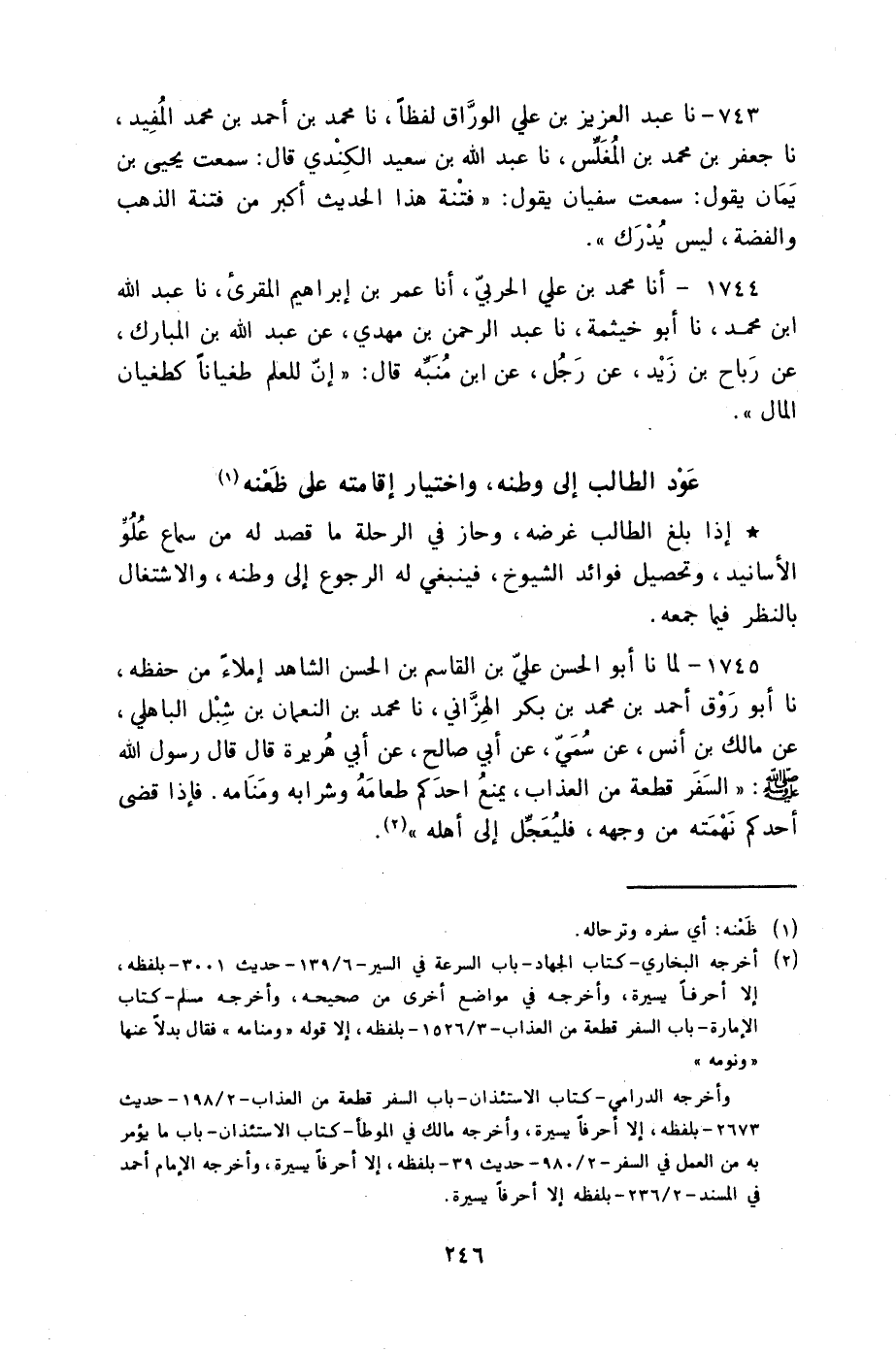 1745 - لِمَا نا أَبُو الْحَسَنِ عَلِيُّ بْنُ الْقَاسِمِ بْنِ الْحَسَنِ الشَّاهِدُ إِمْلَاءً مِنْ حِفْظِهِ نا أَبُو رَوْقٍ أَحْمَدُ بْنُ مُحَمَّدِ بْنِ بَكْرٍ الْهِزَّانِيُّ نا مُحَمَّدُ بْنُ النُّعْمَانِ بْنِ شِبْلٍ الْبَاهِلِيُّ، عَنْ مَالِكِ بْنِ أَنَسٍ، عَنْ سُمَيٍّ، عَنْ أَبِي صَالِحٍ، عَنْ أَبِي هُرَيْرَةَ، قَالَ: قَالَ رَسُولُ اللَّهِ صَلَّى اللهُ عَلَيْهِ وَسَلَّمَ: §«السَّفَرُ قِطْعَةٌ مِنَ الْعَذَابِ يَمْنَعُ أَحَدَكُمْ طَعَامَهُ وَشَرَابَهُ وَمَنَامَهُ فَإِذَا قَضَى أَحَدُكُمْ نَهْمَتَهُ مِنْ وَجْهِهِ فَلْيُعَجِّلْ إِلَى أَهْلِهِ» -[247]- قَالَ الشَّيْخُ أَبُو بَكْرٍ: صَدَقَ رَسُولُ اللَّهِ صَلَّى اللهُ عَلَيْهِ وَسَلَّمَ فِي وَصَفِهِ السَّفَرَ وَمَا زَالَ صَادِقًا مَصْدُوقًا فَإِنَّ الْمُسَافِرَ يُقَاسِي مِنَ الْأَهْوَالِ وَمَشَقَّةِ الْحِلِّ وَالتِّرْحَالِ وَمُعَانَاةِ النَّصَبِ وَشِدَّةِ التَّعَبِ وَالسِّيَرِ مَعَ الْخَوْفِ فِي اللَّيْلِ الْبَهِيمِ مَا يَسْتَحِقُّ وَصْفَهُ بِأَنَّهُ الْعَذَابُ الْأَلِيمُ. وَوُجُودُ ذَلِكَ فِي حَقِّ صَاحِبِ الْحَدِيثِ أَكْثَرُ وَحَظُّهُ مِمَّا ذَكَرْنَاهُ أَجْزَلُ مِنْ حَظِّ غَيْرِهِ وَأَوْفَرُ وَلِهَذَا حُكِيَ عَنْ شُعْبَةَ بْنِ الْحَجَّاجِ