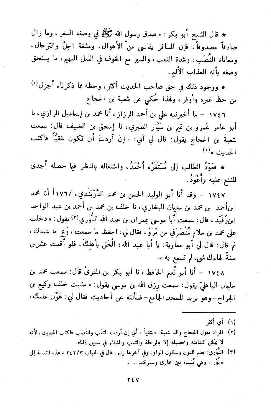 1746 - مَا أَخْبَرَنِيهِ عَلِيُّ بْنُ أَحْمَدَ الرَّزَّازُ، أنا مُحَمَّدُ بْنُ إِسْمَاعِيلَ الرَّازِيُّ، نا أَبُو عَامِرٍ عَمْرُو بْنُ تَمِيمِ بْنِ سَيَّارٍ الطَّبَرِيُّ نا إِسْحَاقُ بْنُ الضَّيْفِ، قَالَ: سَمِعْتُ شُعْبَةَ بْنَ الْحَجَّاجِ، يَقُولُ: قَالَ لِي أَبِي: §«إِنْ أَرَدْتَ أَنْ تَكُونَ شَقِيًّا فَاكْتُبِ الْحَدِيثَ» فَعَوْدُ الطَّالِبِ إِلَى مُسْتَقَرِّهِ أَحْمَدُ وَاشْتِغَالُهُ بِالنَّظَرِ فِيمَا حَصَّلَهُ أَجْدَى لِلنَّفْعِ عَلَيْهِ وَأَعْوَدُ