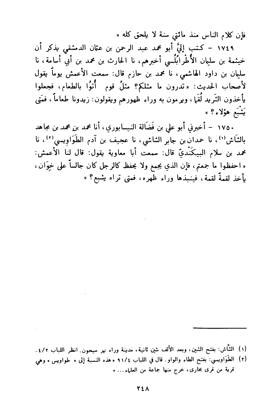 1749 - كَتَبَ إِلَيَّ أَبُو مُحَمَّدٍ عَبْدُ الرَّحْمَنِ بْنُ عُثْمَانَ الدِّمَشْقِيُّ يَذْكُرُ أَنَّ خَيْثَمَةَ بْنَ سُلَيْمَانَ الْأَطْرَابُلُسِيَّ أَخْبَرَهُمْ نا الْحَارِثُ بْنُ مُحَمَّدِ بْنِ أَبِي أُسَامَةَ، نا سُلَيْمَانُ بْنُ دَاوُدَ الْهَاشِمِيُّ، نا مُحَمَّدُ بْنُ خَازِمٍ، قَالَ: سَمِعْتُ الْأَعْمَشَ، يَوْمًا يَقُولُ لِأَصْحَابِ الْحَدِيثِ: §«تَدْرُونَ مَا مَثَلُكُمْ مَثَلُ قَوْمٍ أُتُوا بِالطَّعَامِ فَجَعَلُوا يَأْخُذُونَ الثَّرِيدَ لُقَمًا وَيُرْمَوْنَ بِهِ وَرَاءَ ظُهُورِهِمْ وَيَقُولُونَ زِيدُونَا طَعَامًا فَمَتَى يَشْبَعُ هَؤُلَاءِ؟»