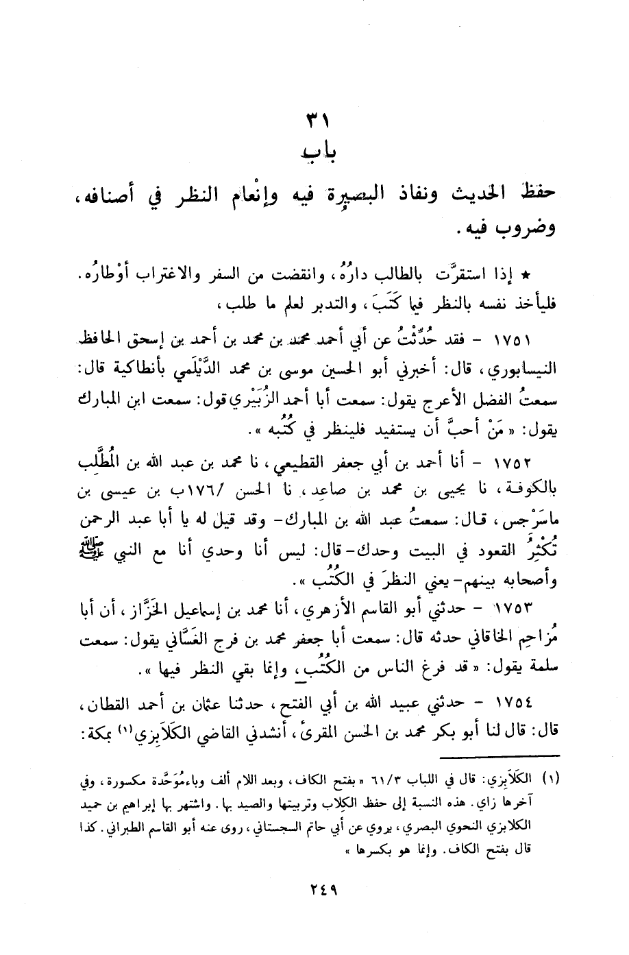1751 - فَقَدْ حُدِّثْتُ عَنْ أَبِي أَحْمَدَ مُحَمَّدِ بْنِ مُحَمَّدِ بْنِ أَحْمَدَ بْنِ إِسْحَاقَ الْحَافِظِ النَّيْسَابُورِيِّ قَالَ: أَخْبَرَنِي أَبُو الْحُسَيْنِ مُوسَى بْنُ مُحَمَّدٍ الدَّيْلَمِيُّ بِأَنْطَاكِيَّةَ قَالَ: سَمِعْتُ الْفَضْلَ الْأَعْرَجَ، يَقُولُ: سَمِعْتُ أَبَا أَحْمَدَ الزُّبَيْرِيَّ، قَالَ: سَمِعْتُ ابْنَ الْمُبَارَكِ، يَقُولُ: «§مَنْ أَحَبَّ أَنْ يَسْتَفِيدَ، فَلْيَنْظُرْ فِي كُتُبِهِ»