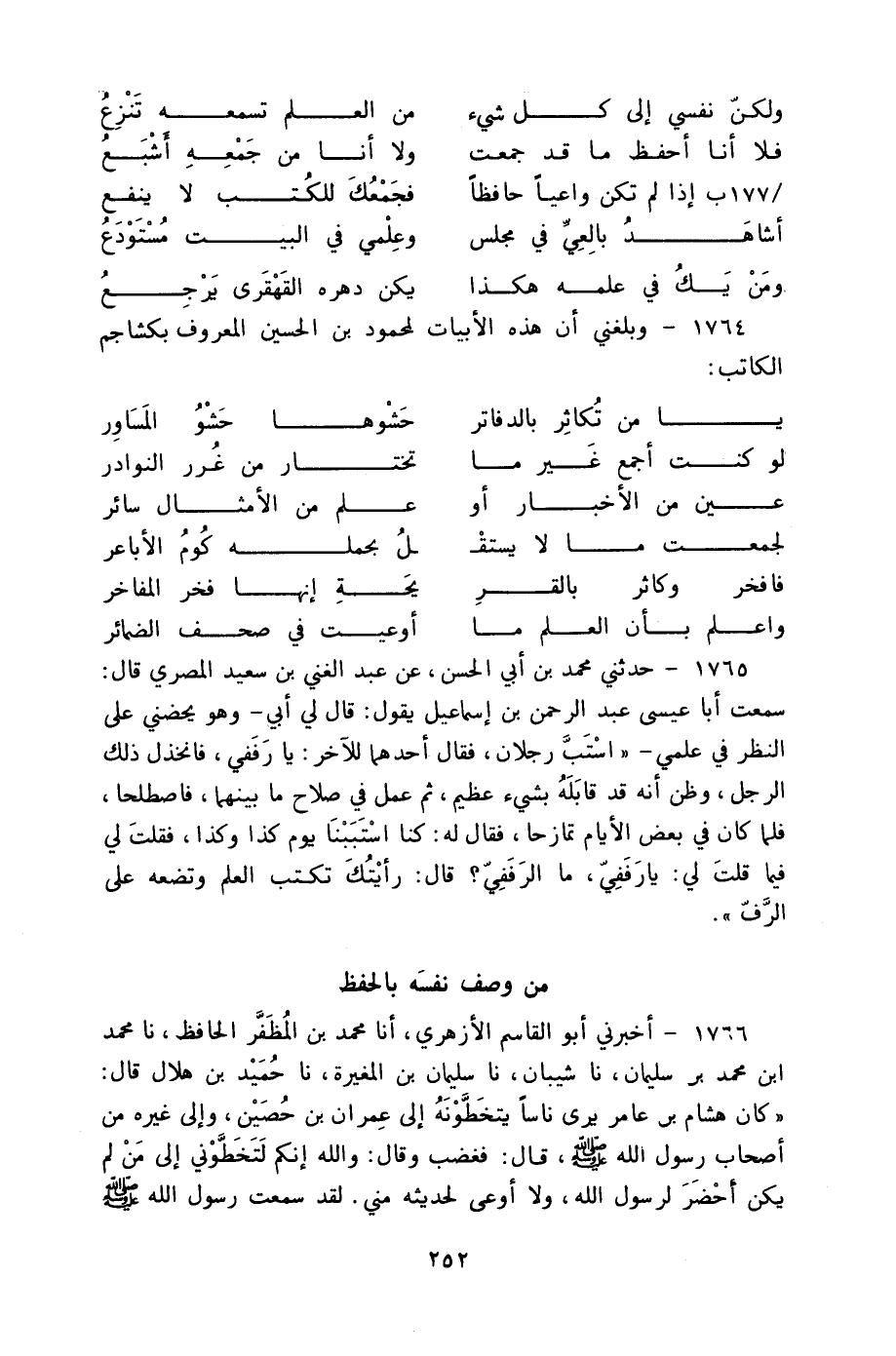 1765 - حَدَّثَنِي مُحَمَّدُ بْنُ أَبِي الْحَسَنِ، عَنْ عَبْدِ الْغَنِيِّ بْنِ سَعِيدٍ الْمِصْرِيِّ، قَالَ: سَمِعْتُ أَبَا عِيسَى عَبْدَ الرَّحْمَنِ بْنَ إِسْمَاعِيلَ، يَقُولُ: قَالَ لِي أَبِي وَهُوَ يَحُضُّنِي عَلَى النَّظَرِ فِي عِلْمِي: " §اسْتَبَّ رَجُلَانِ فَقَالَ أَحَدُهُمَا لِلْآخَرِ: يَا رَفَفِيُّ فَانْخَذَلَ ذَلِكَ الرَّجُلُ وَظَنَّ أَنَّهُ قَدْ قَابَلَهُ بِشَيْءٍ عَظِيمٍ ثُمَّ عَمِلَ فِي صَلَاحِ مَا بَيْنَهُمَا فَاصْطَلَحَا فَلَمَّا كَانَ فِي بَعْضِ الْأَيَّامِ تَمَازَحَا فَقَالَ لَهُ: كُنَّا اسْتَبَبْنَا يَوْمَ كَذَا وَكَذَا فَقُلْتَ لِي فِيمَا قُلْتَ لِي: يَا رَفَفِيُّ مَا الرَّفَفِيُّ؟ قَالَ: رَأَيْتُكَ تَكْتُبُ الْعِلْمَ وَتَضَعُهُ عَلَى الرَّفِ "