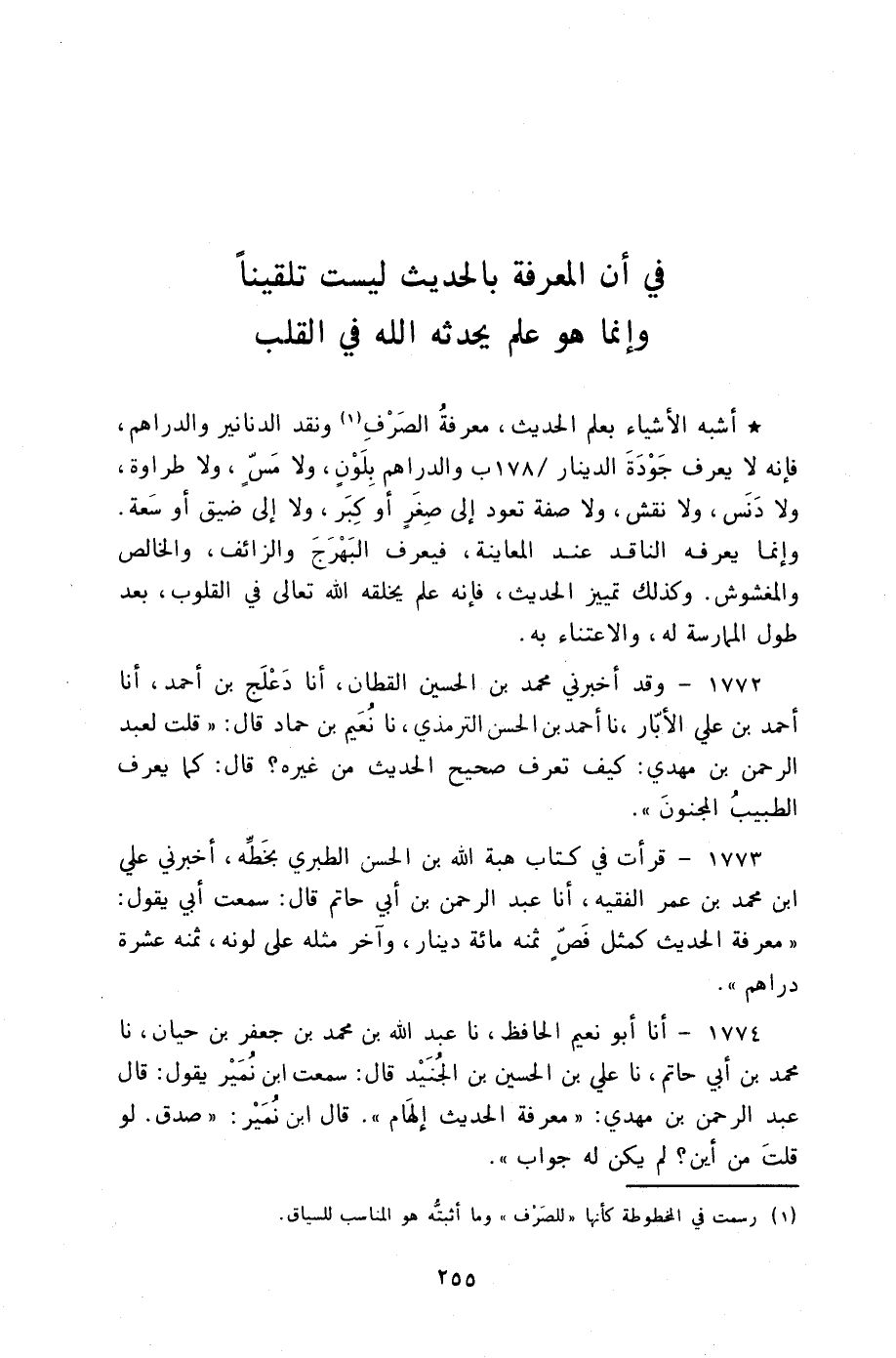§فِي أَنَّ الْمَعْرِفَةَ بِالْحَدِيثِ لَيْسَتْ تَلْقِينًا وَإِنَّمَا هُوَ عِلْمٌ يُحْدِثُهُ اللَّهُ فِي الْقَلْبِ أَشْبَهُ الْأَشْيَاءِ بِعِلْمِ الْحَدِيثِ مَعْرِفَةُ الصَّرْفِ وَنَقْدُ الدَّنَانِيرِ وَالدَّرَاهِمِ فَإِنَّهُ لَا يَعْرِفُ جَوْدَةَ الدِّينَارِ وَالدَّرَاهِمِ بِلَوْنٍ وَلَا مَسٍّ وَلَا طَرَاوَةٍ وَلَا دَنَسٍ وَلَا نَقْشٍ وَلَا صِفَةٍ تَعُودُ إِلَى صِغَرٍ أَوْ كِبَرٍ وَلَا إِلَى ضِيقٍ أَوْ سَعَةٍ وَإِنَّمَا يَعْرِفُهُ النَّاقِدُ عِنْدَ الْمُعَايَنَةِ فَيَعْرِفُ الْبَهْرَجَ وَالزَّائِفَ وَالْخَالِصَ وَالْمَغْشُوشَ وَكَذَلِكَ تَمْيِيزُ الْحَدِيثِ فَإِنَّهُ عِلْمٌ يَخْلُقُهُ اللَّهُ تَعَالَى فِي الْقُلُوبِ بَعْدَ طُولِ الْمُمَارَسَةِ لَهُ وَالِاعْتِنَاءِ بِهِ