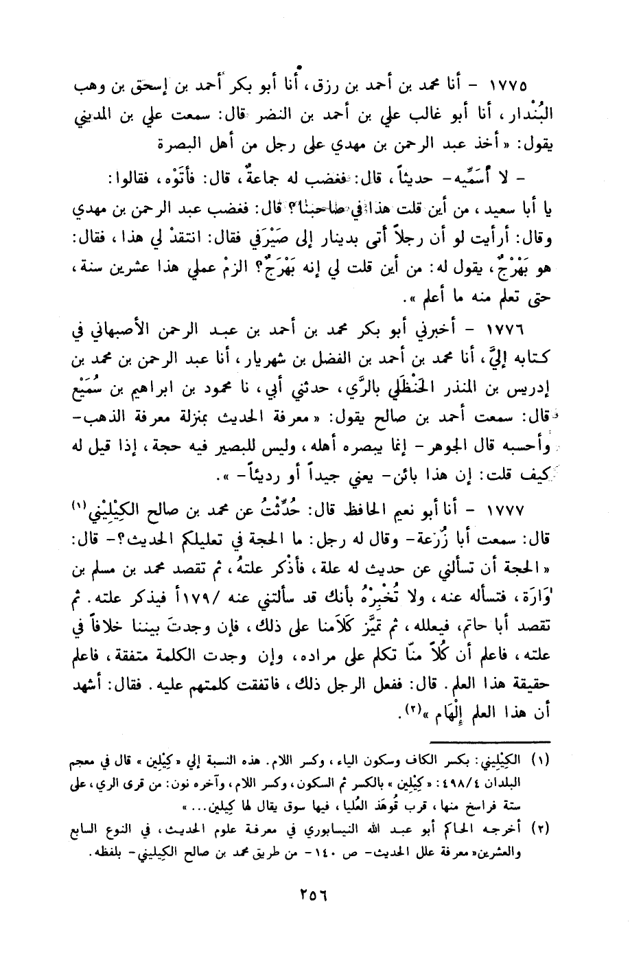 1777 - أنا أَبُو نُعَيْمٍ الْحَافِظُ، قَالَ: حُدِّثْتُ عَنْ مُحَمَّدِ بْنِ صَالِحٍ الْكِيلِينِيِّ، قَالَ: سَمِعْتُ أَبَا زُرْعَةَ، وَقَالَ لَهُ رَجُلٌ: مَا الْحُجَّةُ فِي تَعْلِيلِكُمُ الْحَدِيثَ؟ قَالَ: §" الْحُجَّةُ أَنْ تَسْأَلَنِي عَنْ حَدِيثٍ لَهُ عِلَّةٌ فَأَذْكُرُ عِلَّتَهُ ثُمَّ تَقْصِدُ مُحَمَّدَ بْنَ مُسْلِمِ بْنِ وَارَةَ فَتَسْأَلُهُ عَنْهُ وَلَا تُخْبِرُهُ بِأَنَّكَ قَدْ سَأَلْتَنِي عَنْهُ فَيَذْكُرُ عِلَّتَهُ ثُمَّ تَقْصِدُ أَبَا حَاتِمٍ فَيُعَلِّلُهُ ثُمَّ تُمَيِّزُ كَلَامَنَا عَلَى ذَلِكَ فَإِنْ وَجَدْتَ بَيْنَنَا خِلَافًا فِي عِلَّتِهِ فَاعْلَمْ أَنَّ كَلًّا مِنَّا تَكَلَّمَ عَلَى مُرَادِهِ وَإِنْ وَجَدْتَ الْكَلِمَةَ مُتَّفِقَةً فَاعْلَمْ حَقِيقَةَ هَذَا الْعِلْمِ قَالَ فَفَعَلَ الرَّجُلُ ذَلِكَ فَاتَّفَقَتْ كَلِمَتُهُمْ عَلَيْهِ فَقَالَ: أَشْهَدُ أَنَّ هَذَا الْعِلْمَ إِلْهَامٌ " -[257]- فَمِنَ الْأَحَادِيثِ مَا تَخْفَى عِلَّتُهُ فَلَا يُوقَفُ عَلَيْهَا إِلَّا بَعْدَ النَّظَرِ الشَّدِيدِ وَمُضِيِّ الزَّمَنِ الْبَعِيدِ