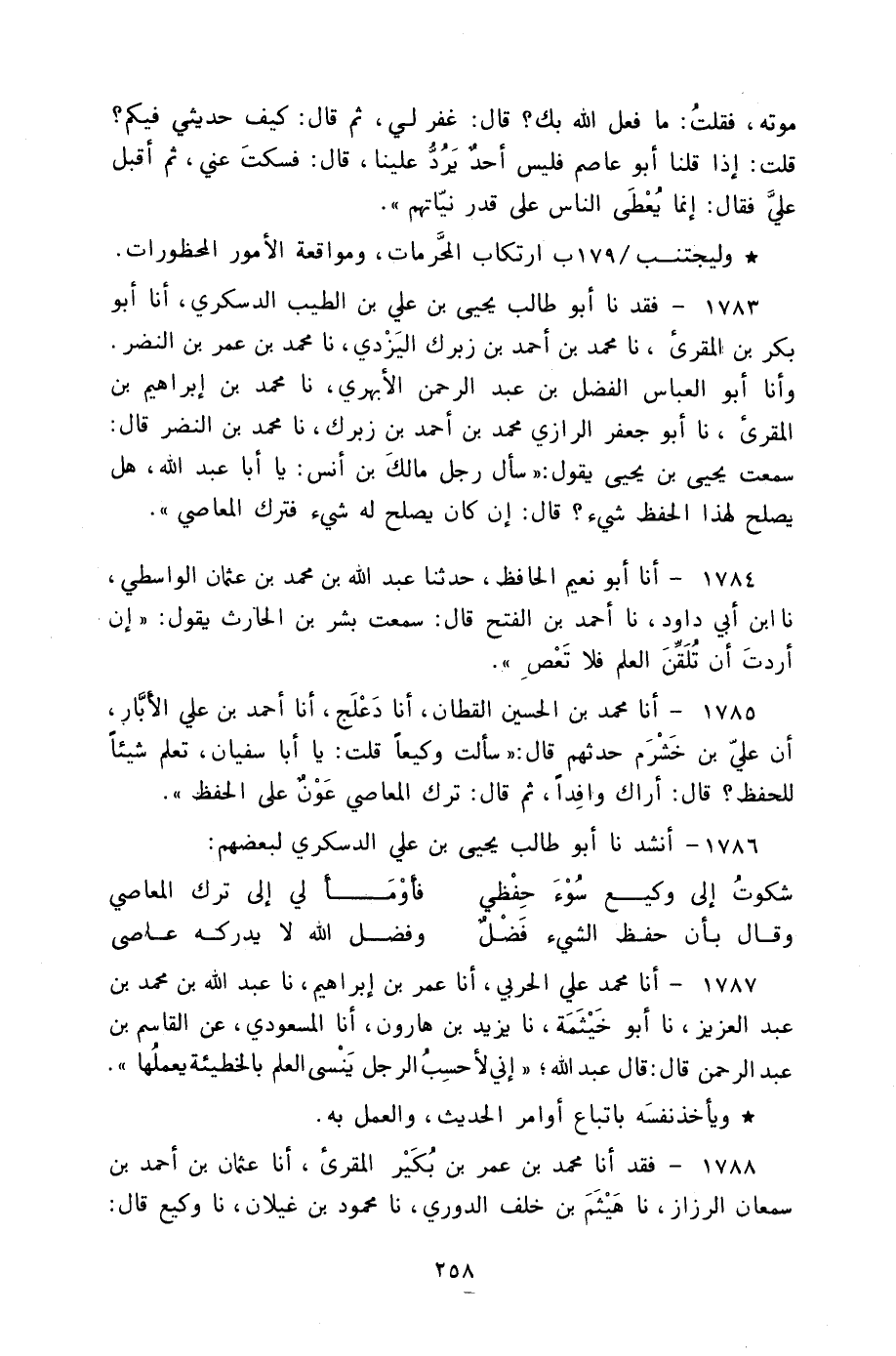 1783 - فَقَدْ نا أَبُو طَالِبٍ يَحْيَى بْنُ عَلِيِّ بْنِ الطَّيِّبِ الدَّسْكَرِيُّ أنا أَبُو بَكْرِ بْنُ الْمُقْرِئِ، نا مُحَمَّدُ بْنُ أَحْمَدَ بْنِ زَبْرَكٍ الْيَزْدِيُّ، نا مُحَمَّدُ بْنُ عُمَرَ بْنِ النَّضْرِ، وأنا أَبُو الْعَبَّاسِ الْفَضْلُ بْنُ عَبْدِ الرَّحْمَنِ الْأَبْهَرِيُّ، نا مُحَمَّدُ بْنُ إِبْرَاهِيمَ بْنِ الْمُقْرِئِ، نا أَبُو جَعْفَرٍ الرَّازِيُّ مُحَمَّدُ بْنُ أَحْمَدَ بْنِ زَبْرَكٍ نا مُحَمَّدُ بْنُ النَّضْرِ، قَالَ: سَمِعْتُ يَحْيَى بْنَ يَحْيَى، يَقُولُ: " سَأَلَ رَجُلٌ مَالِكَ بْنَ أَنَسٍ: يَا أَبَا عَبْدِ اللَّهِ هَلْ يَصْلُحُ لِهَذَا الْحِفْظِ شَيْءٌ؟ قَالَ: §إِنْ كَانَ يَصْلُحُ لَهُ شَيْءٌ فَتَرْكُ الْمَعَاصِي "