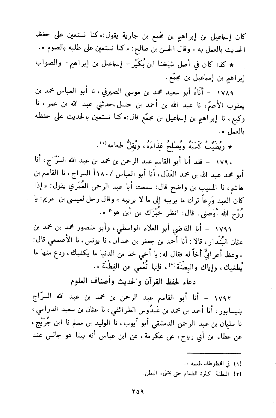 1789 - أَنَاهُ أَبُو سَعِيدٍ مُحَمَّدُ بْنُ مُوسَى الصَّيْرَفِيُّ نا أَبُو الْعَبَّاسِ مُحَمَّدُ بْنُ يَعْقُوبَ الْأَصَمُّ نا عَبْدُ اللَّهِ بْنُ أَحْمَدَ بْنِ حَنْبَلٍ، حَدَّثَنِي عَبْدُ اللَّهِ بْنُ عُمَرَ، نا وَكِيعٌ، نا إِبْرَاهِيمُ بْنُ إِسْمَاعِيلَ بْنِ مُجَمِّعٍ، قَالَ: §«كُنَّا نَسْتَعِينُ بِالْحَدِيثِ عَلَى حِفْظِهِ بِالْعَمَلِ» وَيُطَيِّبُ كَسْبَهُ وَيُصْلِحُ غِذَاءَهُ وَيُقِلُّ طَعَامَهُ