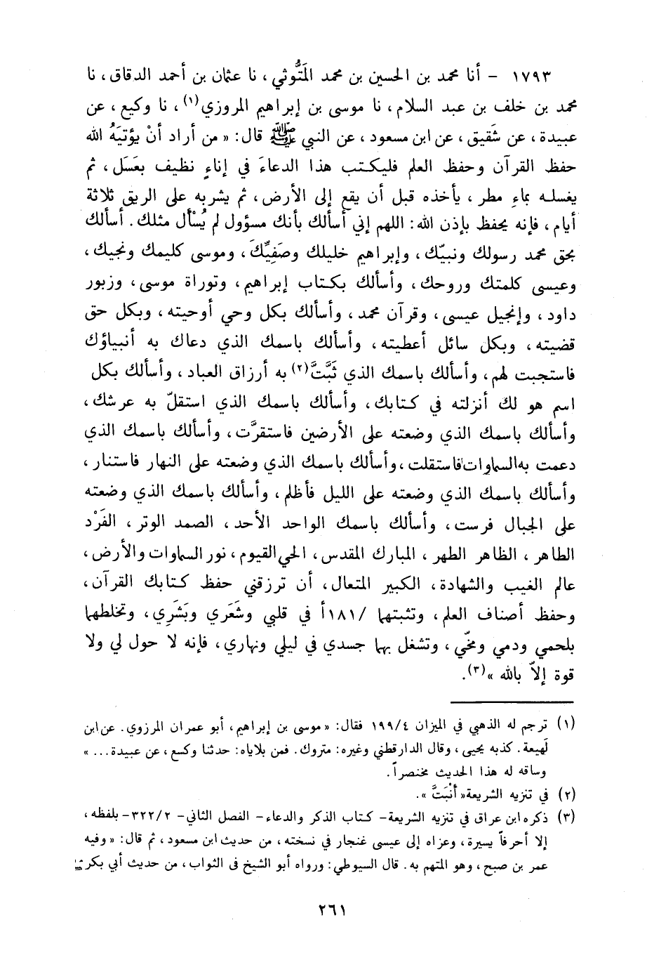 1793 - أنا مُحَمَّدُ بْنُ الْحُسَيْنِ بْنِ مُحَمَّدِ الْمَتُّوثِيُّ، نا عُثْمَانُ بْنُ أَحْمَدَ الدَّقَّاقُ، نا مُحَمَّدُ بْنُ خَلَفِ بْنِ عَبْدِ السَّلَامِ، نا مُوسَى بْنُ إِبْرَاهِيمَ الْمَرْوَزِيُّ، نا وَكِيعٌ، عَنْ عُبَيْدَةَ، عَنْ شَقِيقٍ، عَنِ ابْنِ مَسْعُودٍ، عَنِ النَّبِيِّ صَلَّى اللهُ عَلَيْهِ وَسَلَّمَ قَالَ: " §مَنْ أَرَادَ أَنْ يُؤْتِيَهُ اللَّهُ حِفْظَ الْقُرْآنِ وَحِفْظَ الْعِلْمِ، فَلْيَكْتُبْ هَذَا الدُّعَاءَ فِي إِنَاءٍ نَظِيفٍ بِعَسَلٍ ثُمَّ يَغْسِلُهُ بِمَاءِ مَطَرٍ يَأْخُذُهُ قَبْلَ أَنْ يَقَعَ إِلَى الْأَرْضِ، ثُمَّ يَشْرَبُهُ عَلَى الرِّيقِ ثَلَاثَةَ أَيَّامٍ فَإِنَّهُ يَحْفَظُ بِإِذْنِ اللَّهِ: اللَّهُمَّ إِنِّي أَسْأَلُكَ بِأَنَّكَ مَسْئُولٌ لَمْ يُسْأَلْ مِثْلُكَ، أَسْأَلُكَ بِحَقِّ مُحَمَّدٍ رَسُولِكَ وَنَبِيِّكَ، وَإِبْرَاهِيمَ خَلِيلِكَ وَصَفِيِّكَ، وَمُوسَى كَلِيمِكَ وَنَجِيِّكَ، وَعِيسَى كَلِمَتِكَ وَرُوحِكَ، وَأَسْأَلُكَ بِكِتَابِ إِبْرَاهِيمَ، وَتَوْرَاةِ مُوسَى، وُزَبُورِ دَاوُدَ، وَإِنْجِيلِ عِيسَى، وَقُرْآنِ مُحَمَّدٍ، وَأَسْأَلُكَ بِكُلِّ وَحْيٍ أَوْحَيْتَهُ، وَبِكُلِّ حَقٍّ قَضَيْتَهُ، وَبِكُلِّ سَائِلٍ أَعْطَيْتَهُ، وَأَسْأَلُكَ بِاسْمِكَ الَّذِي دَعَاكَ بِهِ أَنْبِيَاؤُكَ فَاسْتَجَبْتَ لَهُمْ، وَأَسْأَلُكَ بِاسْمِكَ الَّذِي ثَبَتَ بِهِ أَرْزَاقُ الْعِبَادِ، وَأَسْأَلُكَ بِكُلِّ اسْمٍ هُوَ لَكَ أَنْزَلْتَهُ فِي كِتَابِكَ، وَأَسْأَلُكَ بِاسْمِكَ الَّذِي اسْتَقَلَّ بِهِ عَرْشُكَ، وَأَسْأَلُكَ بِاسْمِكَ الَّذِي وَضَعْتَهُ عَلَى الْأَرَضِينَ فَاسْتَقَرَّتْ، وَأَسْأَلُكَ بِاسْمِكَ الَّذِي دَعَمْتَ بِهِ السَّمَاوَاتِ فَاسْتَقَلَّتْ، وَأَسْأَلُكَ بِاسْمِكَ الَّذِي وَضَعْتَهُ عَلَى النَّهَارِ فَاسْتَنَارَ، وَأَسْأَلُكَ بِاسْمِكَ الَّذِي وَضَعْتَهُ عَلَى اللَّيْلِ فَأَظْلَمَ، وَأَسْأَلُكَ بِاسْمِكَ الَّذِي وَضَعْتَهُ عَلَى الْجِبَالِ فَرَسَتْ، وَأَسْأَلُكَ بِاسْمِكَ الْوَاحِدِ الْأَحَدِ الصَّمَدِ الْوِتْرِ الْفَرْدِ الطَّاهِرِ الظَّاهِرِ الطُّهْرِ الْمُبَارَكِ الْمُقَدَّسِ الْحَيِّ الْقَيُّومِ نُورِ السَّمَاوَاتِ وَالْأَرْضِ عَالِمِ الْغَيْبِ وَالشَّهَادَةِ الْكَبِيرِ الْمُتَعَالِ أَنْ تَرْزُقَنِي حِفْظَ كِتَابِكَ الْقُرْآنِ وَحِفْظَ أَصْنَافِ الْعِلْمِ، وَتُثْبِتْهُمَا فِي قَلْبِي وَشَعْرِي وَبَشَرِي وَتُخْلِطْهُمَا بِلَحْمِي وَدَمِي وَمُخِّي وَتَشْغَلَ بِهِمَا جَسَدِي فِي لَيْلِي وَنَهَارِي، فَإِنَّهُ لَا حَوْلَ لِي وَلَا قُوَّةَ إِلَّا بِاللَّهِ "
