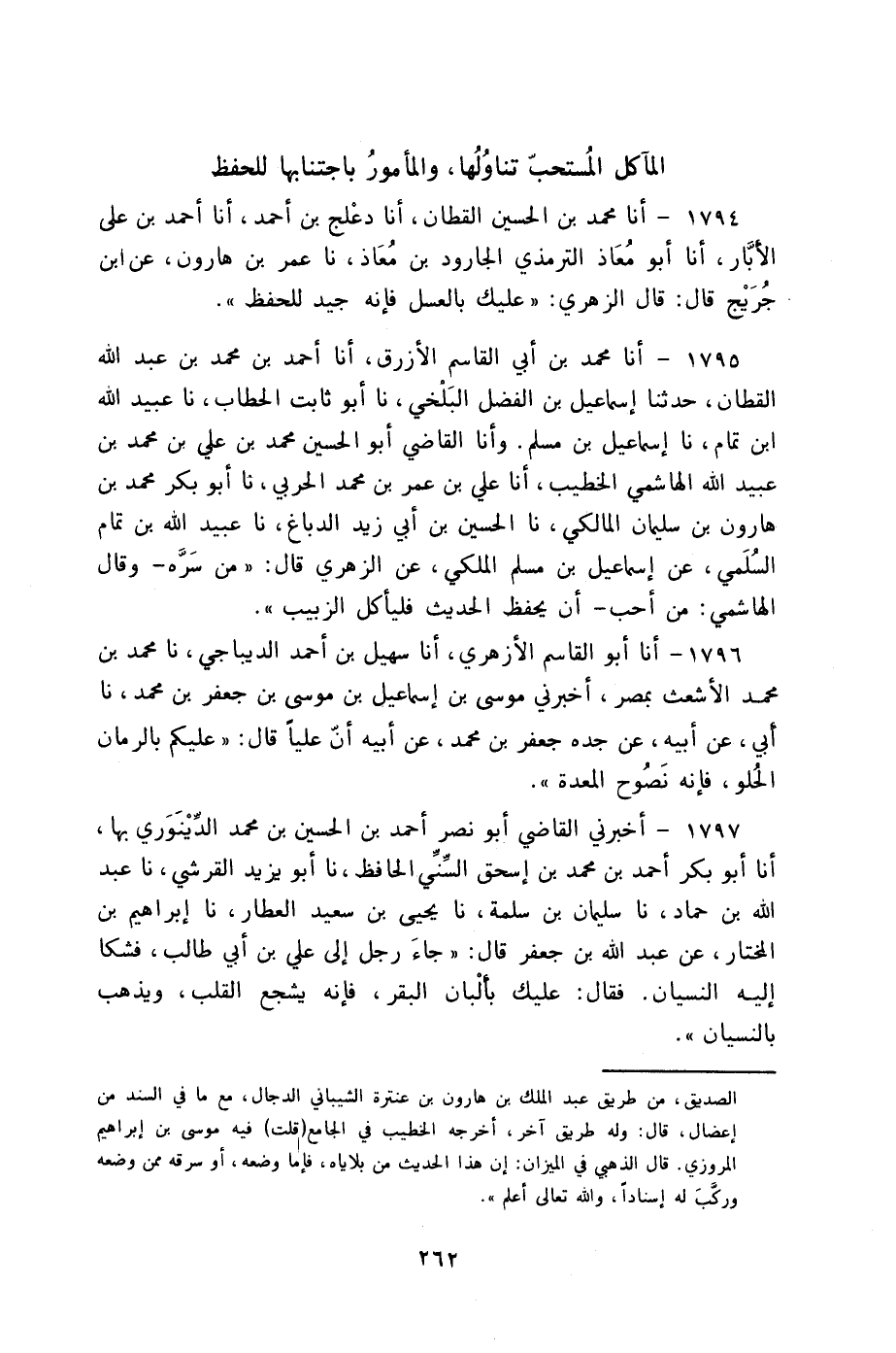 1795 - أنا مُحَمَّدُ بْنُ أَبِي الْقَاسِمِ الْأَزْرَقُ، أنا أَحْمَدُ بْنُ مُحَمَّدِ بْنِ عَبْدِ اللَّهِ الْقَطَّانُ، حَدَّثَنَا إِسْمَاعِيلُ بْنُ الْفَضْلِ الْبَلْخِيُّ، نا أَبُو ثَابِتٍ الْحَطَّابُ، نا عُبَيْدُ اللَّهِ بْنُ تَمَّامٍ، نا إِسْمَاعِيلُ بْنُ مُسْلِمٍ، وأنا الْقَاضِي أَبُو الْحُسَيْنِ مُحَمَّدُ بْنُ عَلِيِّ بْنِ مُحَمَّدِ بْنِ عُبَيْدِ اللَّهِ الْهَاشِمِيُّ الْخَطِيبُ أنا عَلِيُّ بْنُ عُمَرَ بْنِ مُحَمَّدٍ الْحَرْبِيُّ، نا أَبُو بَكْرٍ مُحَمَّدُ بْنُ هَارُونَ بْنِ سُلَيْمَانَ الْمَالِكِيُّ نا الْحُسَيْنُ بْنُ أَبِي زَيْدٍ الدَّبَّاغُ، نا عُبَيْدُ اللَّهِ بْنُ تَمَّامٍ السُّلَمِيُّ، عَنْ إِسْمَاعِيلَ بْنِ مُسْلِمٍ الْمَلَكِيُّ، عَنِ الزُّهْرِيِّ، قَالَ: " §مَنْ سَرَّهُ وَقَالَ الْهَاشِمِيُّ: مَنْ أَحَبَّ أَنْ يَحْفَظَ الْحَدِيثَ فَلْيَأْكُلِ الزَّبِيبَ "