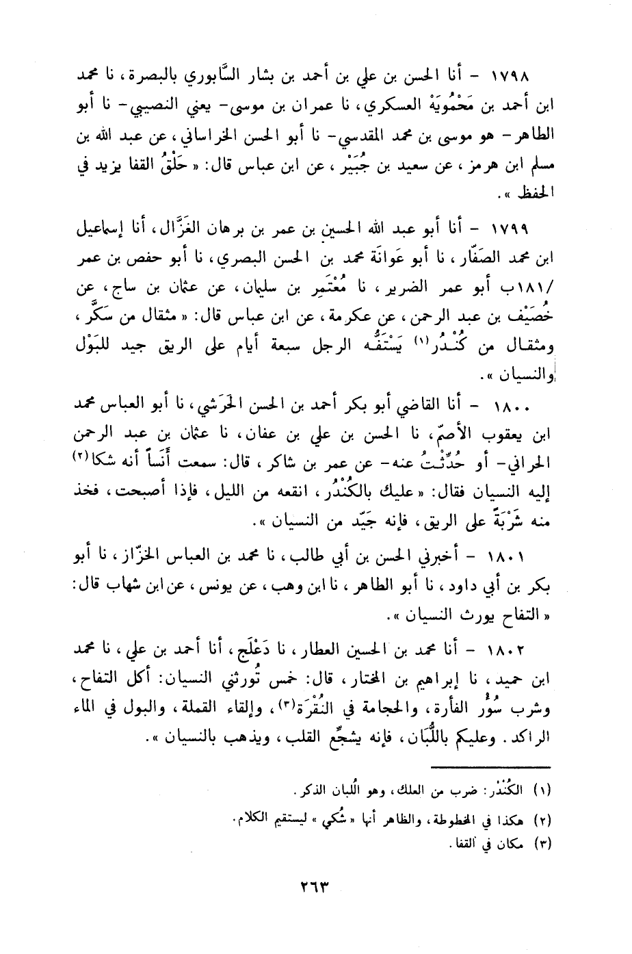 1800 - أنا الْقَاضِي أَبُو بَكْرٍ أَحْمَدُ بْنُ الْحَسَنِ الْحَرَشِيُّ نا أَبُو الْعَبَّاسِ مُحَمَّدُ بْنُ يَعْقُوبَ الْأَصَمُّ نا الْحَسَنُ بْنُ عَلِيِّ بْنِ عَفَّانَ، نا عُثْمَانُ بْنُ عَبْدِ الرَّحْمَنِ الْحَرَّانِيُّ، أَوْ حُدِّثْتُ عَنْهُ، عَنْ عُمَرَ بْنِ شَاكِرٍ، قَالَ: سَمِعْتُ أَنَسًا: §«أَنَّهُ شَكَا إِلَيْهِ النِّسْيَانَ فَقَالَ عَلَيْكَ بِالْكُنْدُرِ انْقَعْهُ مِنَ اللَّيْلِ فَإِذَا أَصْبَحْتَ فَخُذْ مِنْهُ شَرْبَةً عَلَى الرِّيقِ فَإِنَّهُ جَيِّدٌ مِنَ النِّسْيَانِ»