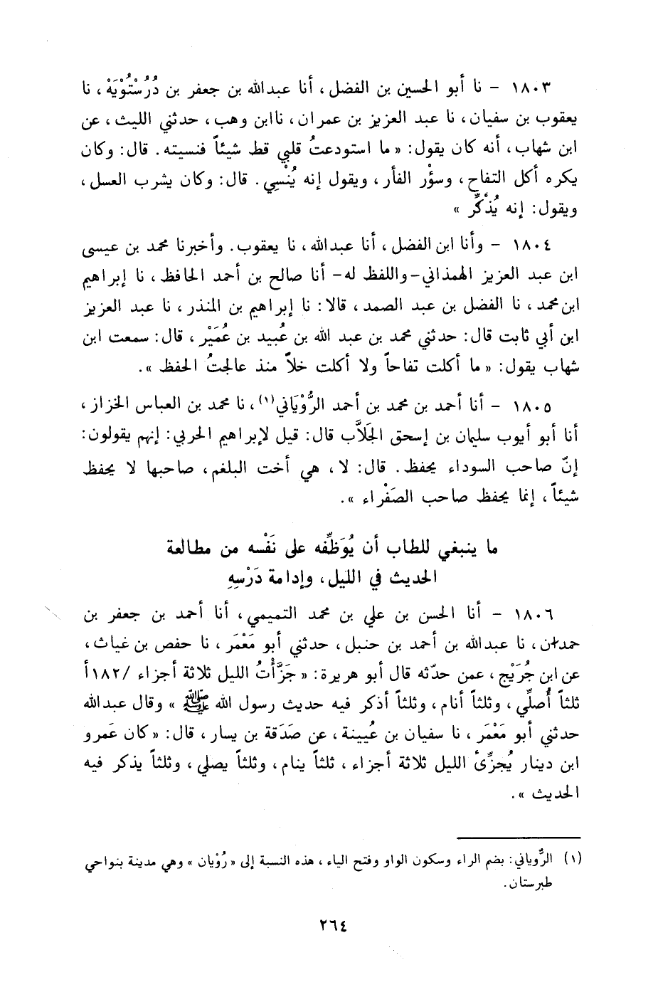 1806 - أنا الْحَسَنُ بْنُ عَلِيِّ بْنِ مُحَمَّدٍ التَّمِيمِيُّ، أنا أَحْمَدُ بْنُ جَعْفَرِ بْنِ حَمْدَانَ، نا عَبْدُ اللَّهِ بْنُ أَحْمَدَ بْنِ حَنْبَلٍ، حَدَّثَنِي أَبُو مَعْمَرٍ، نا حَفْصُ بْنُ غِيَاثٍ، عَنِ ابْنِ جُرَيْجٍ، عَمَّنْ حَدَّثَهُ قَالَ أَبُو هُرَيْرَةَ: «§جَزَّأْتُ اللَّيْلَ ثَلَاثَةَ أَجْزَاءٍ، ثُلُثًا أُصَلِّي وَثُلُثًا أَنَامُ وَثُلُثًا أَذَكَرُ فِيهِ حَدِيثَ رَسُولِ اللَّهِ صَلَّى اللهُ عَلَيْهِ وَسَلَّمَ»