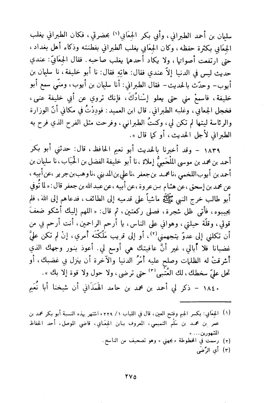 1840 - ذَكَرَ لِي أَحْمَدُ بْنُ مُحَمَّدِ بْنِ حَامِدٍ الْهَمَذَانِيُّ أَنَّ شَيْخَنَا أَبَا نُعَيْمٍ حَدَّثَهُمْ بِهِ، عَنِ الْمُلْحَمِيِّ، هَكَذَا ثُمَّ قَالَ لَهُمْ: وَنَاهُ سُلَيْمَانُ بْنُ أَحْمَدَ بْنِ أَيُّوبَ اللَّخْمِيُّ الطَّبَرَانِيُّ