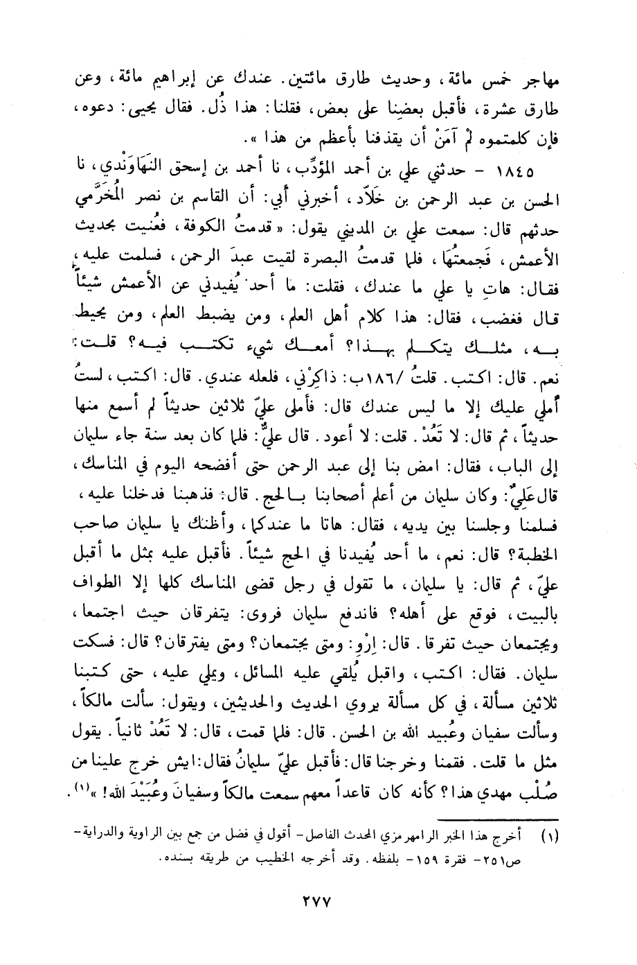 1845 - حَدَّثَنِي عَلِيُّ بْنُ أَحْمَدَ الْمُؤَدِّبُ، نا أَحْمَدُ بْنُ إِسْحَاقَ النَّهَاوَنْدِيُّ، نا الْحَسَنُ بْنُ عَبْدِ الرَّحْمَنِ بْنِ خَلَّادٍ، أَخْبَرَنِي أَبِي أَنَّ الْقَاسِمَ بْنَ نَصْرٍ الْمُخَرِّمِيَّ، حَدَّثَهُمْ قَالَ: سَمِعْتُ عَلِيَّ بْنَ الْمَدِينِيِّ، يَقُولُ: " قَدِمْتُ الْكُوفَةَ فَعُنِيتُ بِحَدِيثِ الْأَعْمَشِ فَجَمَعْتُهَا فَلَمَّا قَدِمْتُ الْبَصْرَةَ لَقِيتُ عَبْدَ الرَّحْمَنِ فَسَلَّمْتُ عَلَيْهِ فَقَالَ: هَاتِ يَا عَلِيُّ مَا عِنْدَكَ فَقُلْتُ: مَا أَحَدٌ يُفِيدُنِي عَنِ الْأَعْمَشِ شَيْئًا قَالَ: فَغَضِبَ فَقَالَ: §هَذَا كَلَامُ أَهْلِ الْعِلْمِ وَمَنْ يَضْبُطُ الْعِلْمَ وَمَنْ يُحِيطُ بِهِ مِثْلُكَ يَتَكَلَّمُ بِهَذَا أَمَعَكَ شَيْءٌ تَكْتُبُ فِيهِ؟ قُلْتُ: نَعَمْ قَالَ: اكْتُبْ قُلْتُ ذَاكِرْنِي فَلَعَلَّهُ عِنْدِي قَالَ: اكْتُبْ لَسْتُ أُمْلِي عَلَيْكَ إِلَّا مَا لَيْسَ عِنْدَكَ قَالَ: فَأَمْلَى عَلَيَّ ثَلَاثِينَ حَدِيثًا لَمْ أَسْمَعْ مِنْهَا حَدِيثًا ثُمَّ قَالَ: لَا تَعُدْ قُلْتُ: لَا أَعُودُ قَالَ عَلِيٌّ: فَلَمَّا كَانَ بَعْدُ سَنَةٍ جَاءَ سُلَيْمَانُ إِلَى الْبَابِ فَقَالَ: أَمْضِ بِنَا إِلَى عَبْدِ الرَّحْمَنِ حَتَّى أَفْضَحَهُ الْيَوْمَ فِي الْمَنَاسِكِ قَالَ عَلِيٌّ: وَكَانَ سُلَيْمَانُ مِنْ أَعْلَمِ أَصْحَابِنَا بِالْحَجِّ قَالَ: فَذَهَبْنَا فَدَخَلْنَا عَلَيْهِ فَسَلَّمْنَا وَجَلَسْنَا بَيْنَ يَدَيْهِ فَقَالَ: هَاتَا مَا عِنْدَكُمَا وَأَظُنُّكَ يَا سُلَيْمَانُ صَاحِبَ الْخُطْبَةِ قَالَ: نَعَمْ مَا أَحَدٌ يُفِيدُنَا فِي الْحَجِّ شَيْئًا فَأَقْبَلَ عَلَيْهِ بِمِثْلِ مَا أَقْبَلَ عَلَيَّ ثُمَّ قَالَ: يَا سُلَيْمَانُ مَا تَقُولُ فِي رَجُلٍ قَضَى الْمَنَاسِكَ كُلَّهَا إِلَّا الطَّوَافَ بِالْبَيْتِ فَوَقَعَ عَلَى أَهْلِهِ؟ فَانْدَفَعَ سُلَيْمَانُ فَرَوَى: يَتَفَرَّقَانِ حَيْثُ اجْتَمَعَا وَيَجْتَمِعَانِ حَيْثُ تَفَرَّقَا قَالَ: ارْوِ وَمَتَى يَجْتَمِعَانِ؟ وَمَتَى يَفْتَرِقَانِ؟ قَالَ: فَسَكَتَ سُلَيْمَانُ فَقَالَ: اكْتُبْ وَأَقْبَلَ يُلْقِي عَلَيْهِ الْمَسَائِلَ وَيُمْلِي عَلَيْهِ حَتَّى كَتَبْنَا ثَلَاثِينَ مَسْأَلَةً فِي كُلِّ مَسْأَلَةٍ يَرْوِي الْحَدِيثَ وَالْحَدِيثَيْنِ وَيَقُولُ: سَأَلْتُ مَالِكًا وَسَأَلْتُ سُفْيَانَ وَعُبَيْدَ اللَّهِ بْنَ الْحَسَنِ قَالَ: فَلَمَّا قُمْتُ قَالَ: لَا تَعُدْ ثَانِيًا يَقُولُ مِثْلَ مَا قُلْتُ فَقُمْنَا وَخَرَجْنَا قَالَ: فَأَقْبَلَ عَلَيَّ سُلَيْمَانُ فَقَالَ: إِيشْ خَرَجَ عَلَيْنَا مِنْ صُلْبِ مَهْدِيٍّ هَذَا كَأَنَّهُ كَانَ قَاعِدًا مَعَهُمْ سَمِعْتُ مَالِكًا وَسُفْيَانَ وَعُبَيْدَ اللَّهِ "
