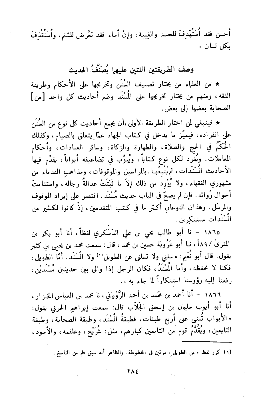 §وَصْفُ الطَّرِيقَتَيْنِ اللَّتَيْنِ عَلَيْهِمَا يُصَنَّفُ الْحَدِيثُ مِنَ الْعُلَمَاءِ مَنْ يَخْتَارُ تَصْنِيفَ السُّنَنِ وَتَخْرِيجَهَا عَلَى الْأَحْكَامِ وَطَرِيقَةِ الْفِقْهِ، وَمِنْهُمْ مَنْ يَخْتَارُ تَخْرِيجَهَا عَلَى الْمُسْنَدِ وَضَمِّ أَحَادِيثَ كُلِّ وَاحِدٍ مِنَ الصَّحَابَةِ بَعْضِهَا إِلَى بَعْضٍ. فَيَنْبَغِي لِمَنِ اخْتَارَ الطَّرِيقَةَ الْأُولَى أَنْ يَجْمَعَ أَحَادِيثَ كُلِّ نَوْعٍ مِنَ السُّنَنِ عَلَى انْفِرَادِهِ فَيُمَيِّزُ مَا يَدْخُلُ فِي كِتَابِ الْجِهَادِ عَمَّا يَتَعَلَّقُ بِالصِّيَامِ وَكَذَلِكَ الْحُكْمُ فِي الْحَجِّ وَالصَّلَاةِ وَالطَّهَارَةِ وَالزَّكَاةِ وَسَائِرِ الْعِبَادَاتِ وَأَحْكَامِ الْمُعَامَلَاتِ وَيُفْرِدُ لِكُلِّ نَوْعٍ كِتَابًا وَيُبَوِّبُ فِي تَضَاعِيفِهِ أَبْوَابًا يُقَدِّمُ فِيهَا الْأَحَادِيثَ الْمُسْنَدَاتِ ثُمَّ يُتْبِعُهَا بِالْمَرَاسِيلِ وَالْمَوْقُوفَاتِ وَمَذَاهِبِ الْقُدَمَاءِ مِنْ مَشْهُورِي الْفُقَهَاءِ وَلَا يُورِدُ مِنْ ذَلِكَ إِلَّا مَا ثَبَتَتْ عَدَالَةُ رِجَالِهِ وَاسْتَقَامَتْ أَحْوَالُ رُوَاتِهِ فَإِنْ لَمْ يَصِحَّ فِي الْبَابِ حَدِيثٌ مُسْنَدٌ اقْتَصَرَ عَلَى إِيرَادِ الْمَوْقُوفِ وَالْمُرْسَلِ وَهَذَانِ النَّوْعَانِ أَكْثَرُ مَا فِي كُتُبِ الْمُتَقَدِّمِينَ إِذْ كَانُوا لَكَثِيرٍ مِنَ الْمُسْنَدَاتِ مُسْتَنْكِرِينَ