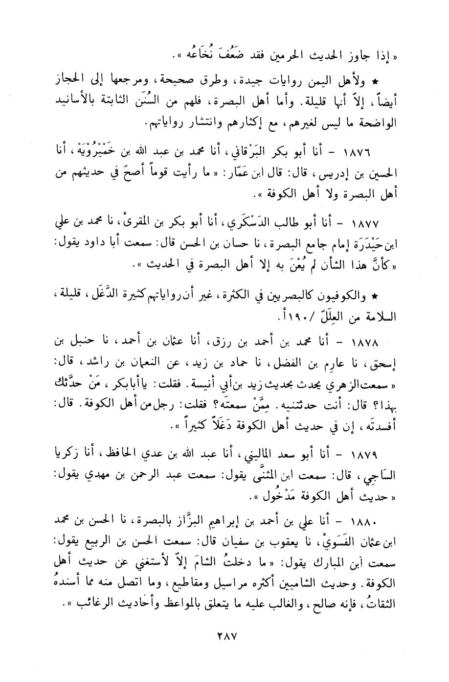1876 - أنا أَبُو بَكْرٍ الْبَرْقَانِيُّ، أنا مُحَمَّدُ بْنُ عَبْدِ اللَّهِ بْنِ خُمَيْرَوَيْهِ، أنا الْحُسَيْنُ بْنُ إِدْرِيسَ، قَالَ: قَالَ ابْنُ عَمَّارٍ: §«مَا رَأَيْتُ قَوْمًا أَصَحَّ فِي حَدِيثِهِمْ مِنْ أَهْلِ الْبَصْرَةِ وَلَا أَهْلِ الْكُوفَةِ»