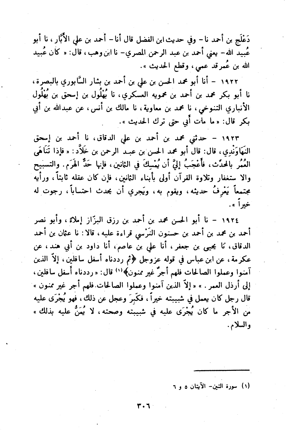 1924 - نا أَبُو الْحَسَنِ مُحَمَّدُ بْنُ أَحْمَدَ بْنِ رِزْقٍ الْبَزَّازُ، إِمْلَاءً وَأَبُو نَصْرٍ أَحْمَدُ بْنُ مُحَمَّدِ بْنِ أَحْمَدَ بْنِ حَسْنُونٍ النَّرْسِيُّ قِرَاءَةً عَلَيْهِ قَالَا: نا عُثْمَانُ بْنُ أَحْمَدَ الدَّقَّاقُ، نا يَحْيَى بْنُ جَعْفَرٍ، أنا عَلِيُّ بْنُ عَاصِمٍ، أنا دَاوُدُ بْنُ أَبِي هِنْدَ، عَنْ عِكْرِمَةَ، عَنِ ابْنِ عَبَّاسٍ: " §فِي قَوْلِهِ عَزَّ وَجَلَّ {ثُمَّ رَدَدْنَاهُ أَسْفَلَ سَافِلِينَ إِلَّا الَّذِينَ آمَنُوا وَعَمِلُوا الصَّالِحَاتِ فَلَهُمْ أَجْرٌ غَيْرُ مَمْنُونٍ} [التين: 6] قَالَ: {رَدَدْنَاهُ أَسْفَلَ سَافِلِينَ} [التين: 5] إِلَى أَرْذَلِ الْعُمُرِ {إِلَّا الَّذِينَ آمَنُوا وَعَمِلُوا الصَّالِحَاتِ فَلَهُمْ أَجْرٌ غَيْرُ مَمْنُونٍ} [التين: 6] قَالَ: رَجُلٌ كَانَ يَعْمَلُ فِي شَبِيبَتِهِ خَيْرًا فَكَبِرَ وَعَجَلَ عَنْ ذَلِكَ فَهُوَ يُجْرَى عَلَيْهِ مِنَ الْأَجْرِ مَا كَانَ يُجْرَى عَلَيْهِ فِي شَبِيبَتِهِ وَصِحَّتِهِ لَا يُمَنُّ عَلَيْهِ بِذَلِكَ " وَالسَّلَامُ.