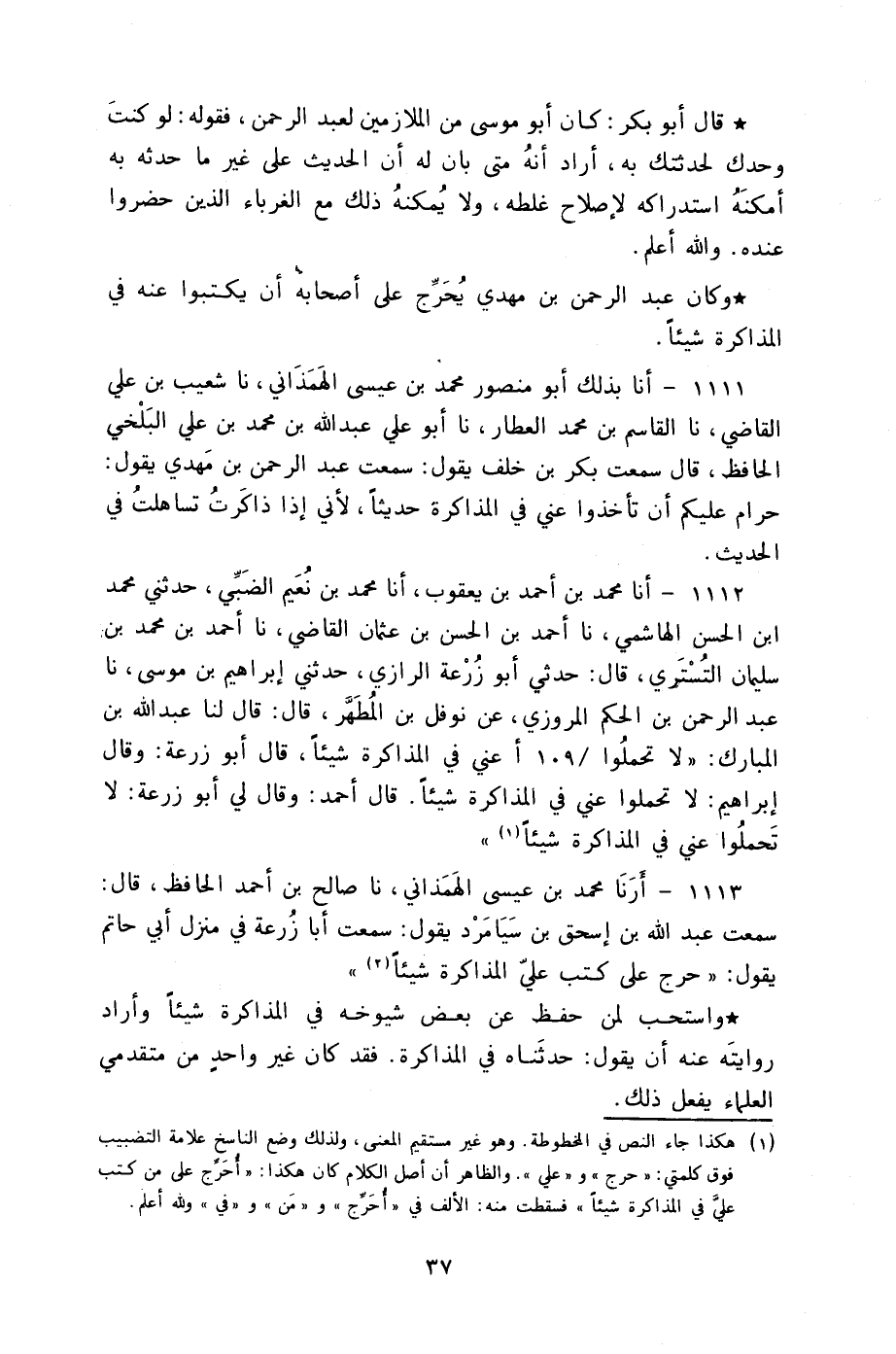1113 - أَرِنَا مُحَمَّدُ بْنُ عِيسَى الْهَمَذَانِيُّ، نا صَالِحُ بْنُ أَحْمَدَ الْحَافِظُ، قَالَ: سَمِعْتُ عَبْدَ اللَّهِ بْنَ إِسْحَاقَ بْنِ سَيَامَرْدَ، يَقُولُ: سَمِعْتُ أَبَا زُرْعَةَ، فِي مَنْزِلِ أَبِي حَاتِمٍ يَقُولُ: §«أُحَرِّجُ عَلَى مَنْ كَتَبَ عَلَيَّ فِي الْمُذَاكَرَةِ شَيْئًا» وَاسْتَحِبُّ لِمَنْ حَفِظَ عَنْ بَعْضِ شُيُوخِهِ فِي الْمُذَاكَرَةِ شَيْئًا وَأَرَادَ رِوَايَتَهُ عَنْهُ أَنْ يَقُولَ حَدَّثَنَاهُ فِي الْمُذَاكَرَةِ فَقَدْ كَانَ غَيْرُ وَاحِدٍ مِنْ مُتَقَدِّمِي الْعُلَمَاءِ يَفْعَلُ ذَلِكَ