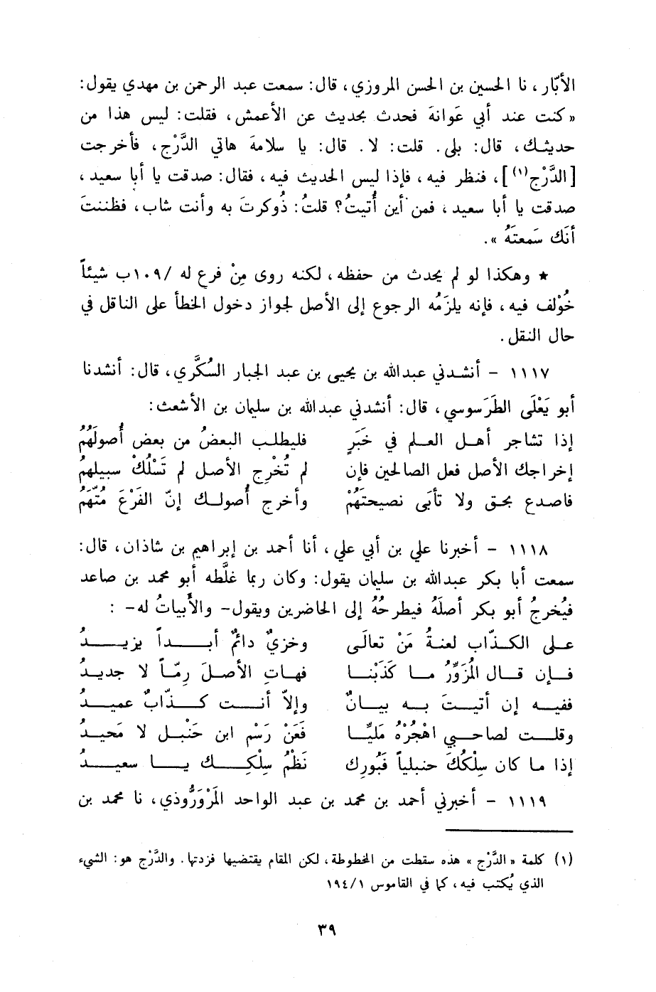 1119 - أَخْبَرَنِي أَحْمَدُ بْنُ مُحَمَّدِ بْنِ عَبْدِ الْوَاحِدِ الْمَرْوَرُّوذِيُّ، نا مُحَمَّدُ بْنُ -[40]- عَبْدِ اللَّهِ الْحَافِظُ النَّيْسَابُورِيُّ، نا مُحَمَّدُ بْنُ صَالِحِ بْنِ هَانِئٍ، نا مُحَمَّدُ بْنُ نُعَيْمٍ، نا عَمْرُو بْنُ عَلِيٍّ، نا أَزْهَرُ، نا ابْنُ عَوْنٍ، عَنْ إِبْرَاهِيمَ، عَنْ عَبِيْدَةَ، عَنْ عَبْدِ اللَّهِ، قَالَ رَسُولُ اللَّهِ صَلَّى اللهُ عَلَيْهِ وَسَلَّمَ: «§خَيْرُ النَّاسِ قَرْنِي» قَالَ: فَحَدَّثْتُ بِهِ يَحْيَى بْنَ سَعِيدٍ فَقَالَ: لَيْسَ فِي حَدِيثِ ابْنِ عَوْنٍ عَنْ عَبْدِ اللَّهِ فَقُلْتُ لَهُ بَلَى فِيهِ قَالَ: " لَا قُلْتُ إِنَّ أَزْهَرَ حَدَّثَنَا عَنِ ابْنِ عَوْنٍ عَنْ إِبْرَاهِيمَ عَنْ عُبَيْدَةَ عَنْ عَبْدِ اللَّهِ قَالَ: رَأَيْتُ أَزْهَرَ جَاءَ بِكِتَابِهِ لَيْسَ فِيهِ عَنْ عَبْدِ اللَّهِ قَالَ عَمْرُو بْنُ عَلِيٍّ فَاخْتَلَفْتُ إِلَى أَزْهَرَ قَرِيبًا مِنْ شَهْرٍ لَيَنْظُرَ فِيهِ فَنَظَرَ فِي كِتَابِهِ ثُمَّ خَرَجَ فَقَالَ لَمْ أَجِدْهُ إِلَّا عَنْ عُبَيْدَةَ عَنِ النَّبِيِّ صَلَّى اللهُ عَلَيْهِ وَسَلَّمَ فَيَجِبُ عَلَى الْمُحَدِّثِ الرُّجُوعُ عَمَّا رَوَاهُ إِذَا تَبَيَّنَ أَنَّهُ أَخْطَأَ فِيهِ فَإِذَا لَمْ يَفْعَلْ كَانَ آثِمًا وَعَلَى الطَّالِبِ الْإِمْسَاكُ عَنِ الِاحْتِجَاجِ بِهِ