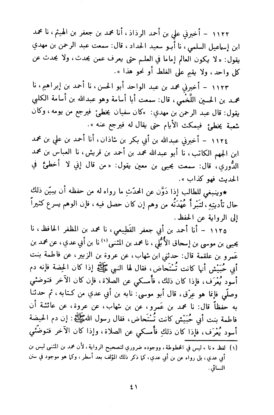 1122 - أَخْبَرَنِي عَلِيُّ بْنُ أَحْمَدَ الرَّذَّاذُ، أنا مُحَمَّدُ بْنُ جَعْفَرِ بْنِ الْهَيْثَمِ، نا مُحَمَّدُ بْنُ إِسْمَاعِيلَ السُّلَمِيُّ، نا أَبُو سَعِيدٍ الْحَدَّادُ، قَالَ: سَمِعْتُ عَبْدَ الرَّحْمَنِ بْنَ مَهْدِيٍّ، يَقُولُ: §«لَا يَكُونُ الْعَالِمُ إِمَامًا فِي الْعِلْمِ حَتَّى يَعْرِفَ عَمَّنْ يُحَدِّثُ وَلَا يُحَدِّثُ عَنْ كُلِّ وَاحِدٍ وَلَا يُقِيمُ عَلَى الْغَلَطِ أَوْ نَحْوَ هَذَا»