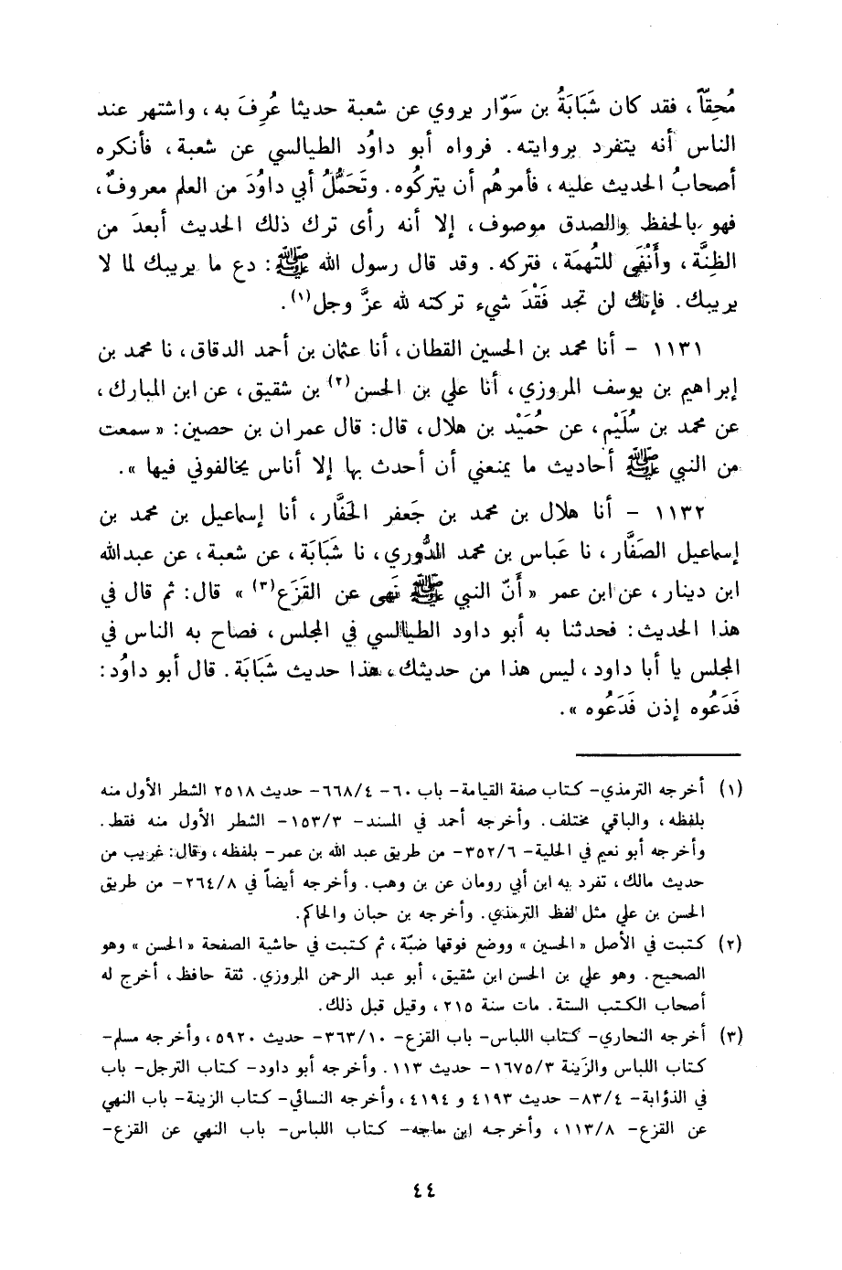 1132 - أنا هِلَالُ بْنُ مُحَمَّدِ بْنِ جَعْفَرٍ الْحَفَّارُ، أنا إِسْمَاعِيلُ بْنُ مُحَمَّدِ بْنِ إِسْمَاعِيلَ الصَّفَّارُ، نا عَبَّاسُ بْنُ مُحَمَّدٍ الدُّورِيُّ، نا شَبَابَةُ، عَنْ شُعْبَةَ، عَنْ عَبْدِ اللَّهِ بْنِ دِينَارٍ، عَنِ ابْنِ عُمَرَ، §«أَنَّ النَّبِيَّ صَلَّى اللهُ عَلَيْهِ وَسَلَّمَ نَهَى عَنِ الْقَزَعِ» قَالَ: ثُمَّ قَالَ فِي هَذَا الْحَدِيثِ فَحَدَّثَنَا بِهِ أَبُو دَاوُدَ الطَّيَالِسِيُّ فِي الْمَجْلِسِ فَصَاحَ بِهِ النَّاسُ فِي الْمَجْلِسِ يَا أَبَا دَاوُدَ لَيْسَ هَذَا مِنْ حَدِيثِكَ هَذَا حَدِيثُ شَبَابَةُ قَالَ: أَبُو دَاوُدَ فَدَعُوهُ إِذَنْ فَدَعُوهُ. حَكَى أَحْمَدَ بْنَ مَنْصُورٍ الرَّمَادِيُّ قِصَّةَ أَبِي دَاوُدَ فِي هَذَا الْحَدِيثِ عَلَى وَجْهٍ آخَرَ