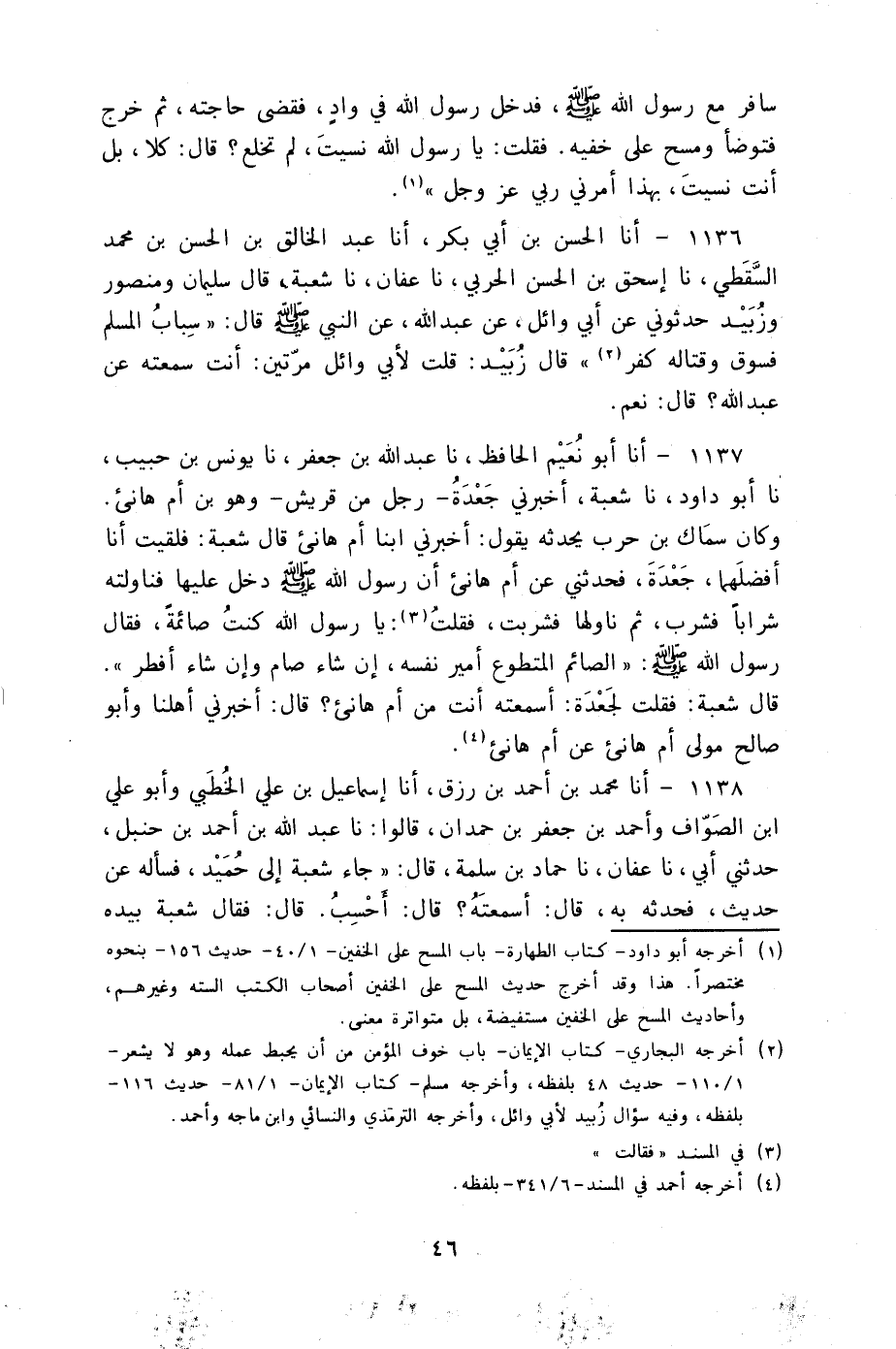 1136 - أنا الْحَسَنُ بْنُ أَبِي بَكْرٍ، أنا عَبْدُ الْخَالِقِ بْنُ الْحَسَنِ بْنِ مُحَمَّدٍ السَّقَطِيُّ، نا إِسْحَاقُ بْنُ الْحَسَنِ الْحَرْبِيُّ، نا عَفَّانُ، نا شُعْبَةُ، قَالَ سُلَيْمَانُ وَمَنْصُورٌ وَزُبَيْدٌ: حَدَّثُونِي عَنْ أَبِي وَائِلٍ، عَنْ عَبْدِ اللَّهِ، عَنِ النَّبِيِّ صَلَّى اللهُ عَلَيْهِ وَسَلَّمَ قَالَ: «§سِبَابُ الْمُسْلِمِ فُسُوقٌ وَقِتَالُهُ كُفْرٌ» قَالَ زُبَيْدٌ: قُلْتُ لِأَبِي وَائِلٍ مَرَّتَيْنِ أَنْتَ سَمِعْتَهُ عَنْ عَبْدِ اللَّهِ؟ قَالَ: «نَعَمْ»