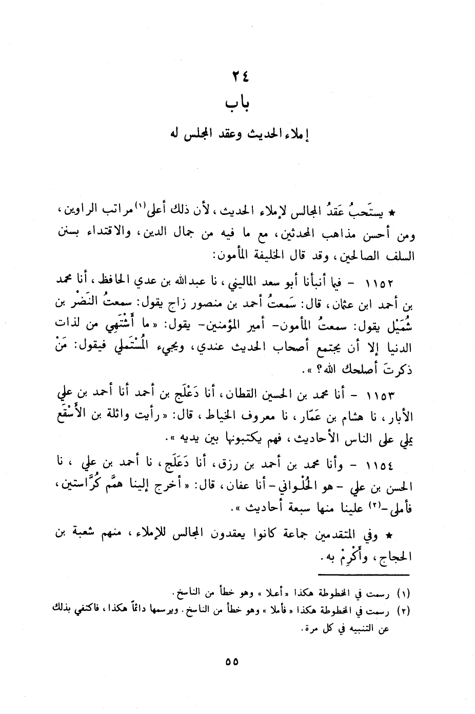 وأنا مُحَمَّدُ بْنُ أَحْمَدَ بْنِ رِزْقٍ، أنا دَعْلَجٌ، نا أَحْمَدُ بْنُ عَلِيٍّ، نا الْحَسَنُ بْنُ عَلِيٍّ هُوَ الْحُلْوَانِيُّ أنا عَفَّانُ قَالَ: §«أَخْرَجَ إِلَيْنَا هَمَّامٌ كَرَّاسَتَيْنِ فَأَمْلَى عَلَيْنَا مِنْهَا سَبْعَةَ أَحَادِيثَ» وَفِي الْمُتَقَدِّمِينَ جَمَاعَةٌ كَانُوا يَعْقِدُونَ الْمَجَالِسَ لِلْإِمْلَاءِ مِنْهُمْ شُعْبَةُ بْنُ الْحَجَّاجِ وَأَكْرِمْ بِهِ -[56]-. وَمِنَ الطَّبَقَةِ الَّتِي تَلِيهِ يَزِيدُ بْنُ هَارُونَ الْوَاسِطِيُّ وَعَاصِمُ بْنُ عَلِيِّ بْنِ عَاصِمٍ التَّمِيمِيُّ وَعَمْرُو بْنُ مَرْزُوقٍ الْبَاهِلِيُّ وَمِنَ الطَّبَقَةِ الثَّالِثَةِ مُحَمَّدُ بْنُ إِسْمَاعِيلَ الْبُخَارِيُّ وَأَبُو مُسْلِمٍ إِبْرَاهِيمُ بْنُ عَبْدِ اللَّهِ الْبَصْرِيُّ وَجَعْفَرُ بْنُ مُحَمَّدِ بْنِ الْحَسَنِ الْفِيرْيَابِيُّ