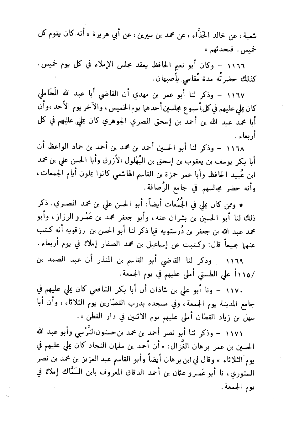 1168 - أنا الْقَاضِي أَبُو الْحَسَنِ عَلِيُّ بْنُ مُحَمَّدِ بْنِ حَبِيبٍ الْبَصْرِيُّ حَدَّثَنِي أَبِي قَالَ: §" كُنَّا نَحْضُرُ مَجْلِسَ أَبِي إِسْحَاقَ إِبْرَاهِيمَ بْنِ عَلِيٍّ الْهُجَيْمِيِّ لِلْحَدِيثِ وَكَانَ يَجْلِسُ عَلَى سَطْحٍ لَهُ وَيَمْتَلِئُ شَارِعُ الْهُجَيْمِ بِالنَّاسِ الَّذِينَ يَحْضُرُونَ لِلسَّمَاعِ وَيُبَلِّغُ الْمُسْتَمْلُونَ عَنِ الْهُجَيْمِيِّ قَالَ: وَكُنْتُ أَقُومُ فِي السَّحَرِ فَأَجِدُ النَّاسَ قَدْ سَبَقُونِي وَأَخَذُوا مَوَاضِعَهُمْ وَحُسِبَ الْمَوْضِعُ الَّذِي يَجْلِسُ النَّاسُ فِيهِ وَكُسِّرَ فَوُجِدَ مَقْعَدُ ثَلَاثِينَ أَلْفَ رَجُلٍ " وَكَانَ كَافَّةُ مَنْ أَدْرَكْنَاهُ مِنَ الشُّيُوخِ نَقْرَأُ عَلَيْهِمُ الْحَدِيثَ قِرَاءَةً وَبَعْضُهُمْ كَانَ يَجْعَلُ فِي كُلِّ أُسْبُوعٍ يَوْمًا لِلْإِمْلَاءِ خَاصَّةً وَبَقِيَّةُ الْأَيَّامِ لِلْقِرَاءَةِ فَمِنْ شُيُوخِنَا الَّذِينَ أَدْرَكْنَاهُمْ وَحَضَرْنَا مَجَالِسَهُمْ لِلْأَمَالِي أَبُو الْحَسَنِ مُحَمَّدُ بْنُ أَحْمَدَ بْنِ رَزْقَوَيْهِ وَأَبُو الْحُسَيْنِ، وَأَبُو الْقَاسِمِ عَلِيٌّ، وَعَبْدُ الْمَلِكِ ابْنَا مُحَمَّدِ بْنِ عَبْدِ اللَّهِ بْنِ بِشْرَانَ وَأَبُو الْفَتْحِ مُحَمَّدُ بْنُ أَحْمَدَ بْنِ أَبِي الْفَوَارِسِ وَأَبُو الْقَاسِمِ عَبْدُ الرَّحْمَنِ بْنُ عُبَيْدِ اللَّهِ الْحَرْبِيُّ وَكَانُوا يُمْلِونَ فِي أَيَّامِ الْجُمُعَاتِ وَكَذَلِكَ الْقَاضِي أَبُو بَكْرٍ أَحْمَدُ بْنُ الْحَسَنِ الْحِيرِيُّ وَأَبُو الْقَاسِمِ عَبْدُ الرَّحْمَنِ بْنُ مُحَمَّدٍ السَّرَّاجُ وَأَبُو إِسْحَاقَ إِبْرَاهِيمُ بْنُ مُحَمَّدٍ الْإِسْفَرَايِينِيُّ حَضَرْتُ أَمَالِيَهُمْ بِنَيْسَابُورَ أَيَّامَ الْجُمُعَاتِ وَكَذَلِكَ حَضَرْتُ إِمْلَاءَ عِيسَى بْنِ غَسَّانَ وَمُحَمَّدِ بْنِ عَلِيِّ بْنِ حَبِيبٍ الْمَتُّوثِيِّ جَمِيعًا بِالْبَصْرَةِ وَإِمْلَاءَ أَبِي طَاهِرٍ الْحُسَيْنِ بْنِ عَلِيِّ بْنِ سَلَمَةَ وَأَبِي مَنْصُورٍ مُحَمَّدِ بْنِ عِيسَى بْنِ عَبْدِ الْعَزِيزِ الْبَزَّازِ كِلَاهُمَا بِهَمَذَانَ