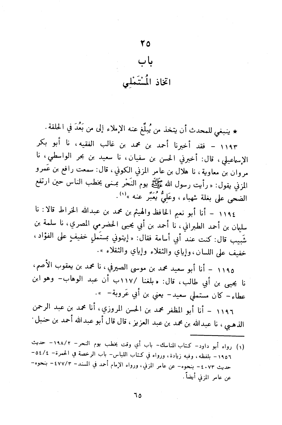 1194 - أنا أَبُو نُعَيْمٍ الْحَافِظُ، وَالْهَيْثَمُ بْنُ مُحَمَّدِ بْنِ عَبْدِ اللَّهِ الْخَرَّاطُ، قَالَا: نا سُلَيْمَانُ بْنُ أَحْمَدَ الطَّبَرَانِيُّ، نا أَحْمَدُ بْنُ أَبِي يَحْيَى الْحَضْرَمِيُّ الْمِصْرِيُّ، نا سَلَمَةُ بْنُ شَبِيبٍ، قَالَ: كُنْتُ عِنْدَ أَبِي أُسَامَةَ فَقَالَ: §«ايتُونِي بِمُسْتَمْلٍ خَفِيفٍ عَلَى الْفُؤَادِ خَفِيفٍ عَلَى اللِّسَانِ وَإِيَّايَ وَالثُّقَلَاءَ وَإِيَّايَ وَالثُّقَلَاءَ»