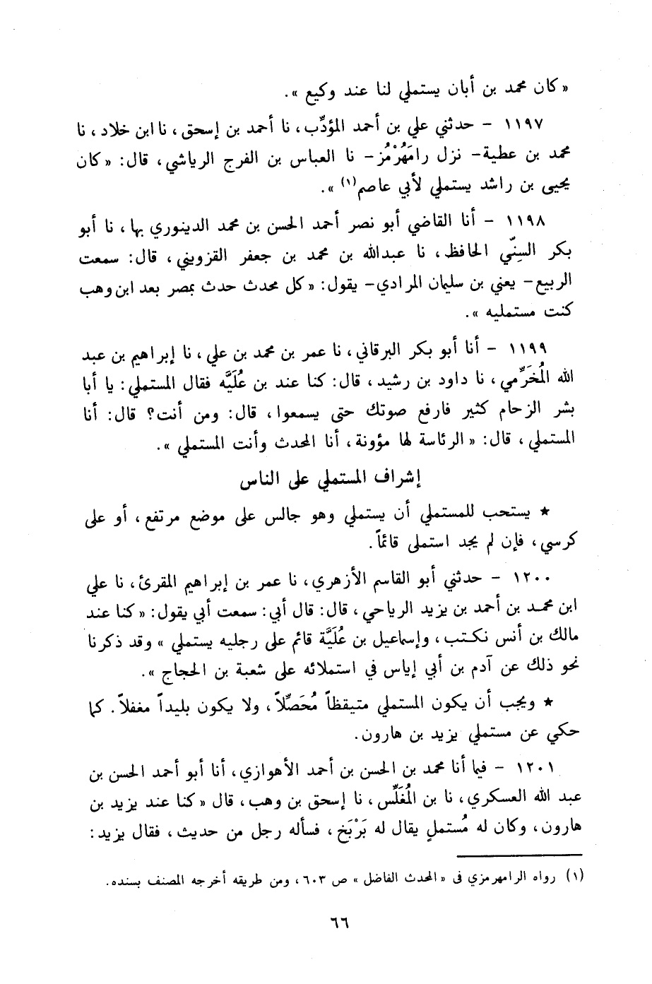 1199 - أنا أَبُو بَكْرٍ الْبَرْقَانِيُّ، نا عُمَرُ بْنُ مُحَمَّدِ بْنِ عَلِيٍّ، نا إِبْرَاهِيمُ بْنُ عَبْدِ اللَّهِ الْمُخَرِّمِيُّ، نا دَاوُدُ بْنُ رُشَيْدٍ، قَالَ: " §كُنَّا عِنْدَ ابْنِ عُلَيَّةَ فَقَالَ الْمُسْتَمْلِي: يَا أَبَا بِشْرٍ: الزِّحَامُ كَثِيرٌ فَارْفَعْ صَوْتَكَ حَتَّى يَسْمَعُوا قَالَ: وَمَنْ أَنْتَ؟ قَالَ: أَنَا الْمُسْتَمْلِي قَالَ: الرِّئَاسَةُ لَهَا مَؤُونَةٌ أَنَا الْمُحَدِّثُ وَأَنْتَ الْمُسْتَمْلِي "