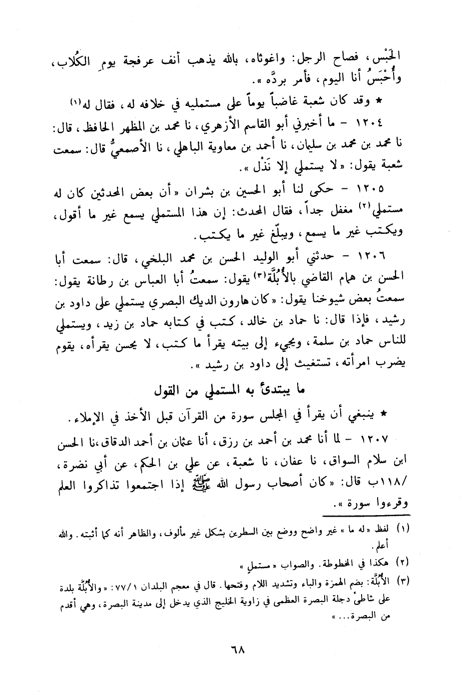 1204 - مَا أَخْبَرَنِي أَبُو الْقَاسِمِ الْأَزْهَرِيُّ، نا مُحَمَّدُ بْنُ الْمُظْهِرِ الْحَافِظُ، قَالَ نا مُحَمَّدُ بْنُ مُحَمَّدِ بْنِ سُلَيْمَانَ، نا أَحْمَدُ بْنُ مُعَاوِيَةَ الْبَاهِلِيُّ، نا الْأَصْمَعِيُّ، قَالَ: سَمِعْتُ شُعْبَةَ يَقُولُ: §«لَا يَسْتَمْلِي إِلَّا نَذْلٌ»