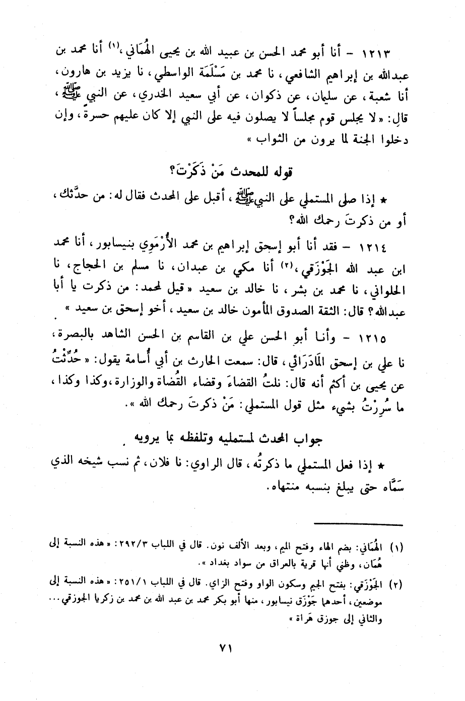 §جَوَابُ الْمُحَدِّثِ لِمُسْتَمْلِيهِ وَتَلَفُّظُهُ بِمَا يَرْوِيهِ إِذَا فَعَلَ الْمُسْتَمْلِي مَا ذَكَرْتُهُ قَالَ الرَّاوِي: نَا فُلَانٌ ثُمَّ نَسَبَ شَيْخَهُ الَّذِي سَمَّاهُ حَتَّى يَبْلُغَ بِنَسَبِهِ مُنْتَهَاهُ